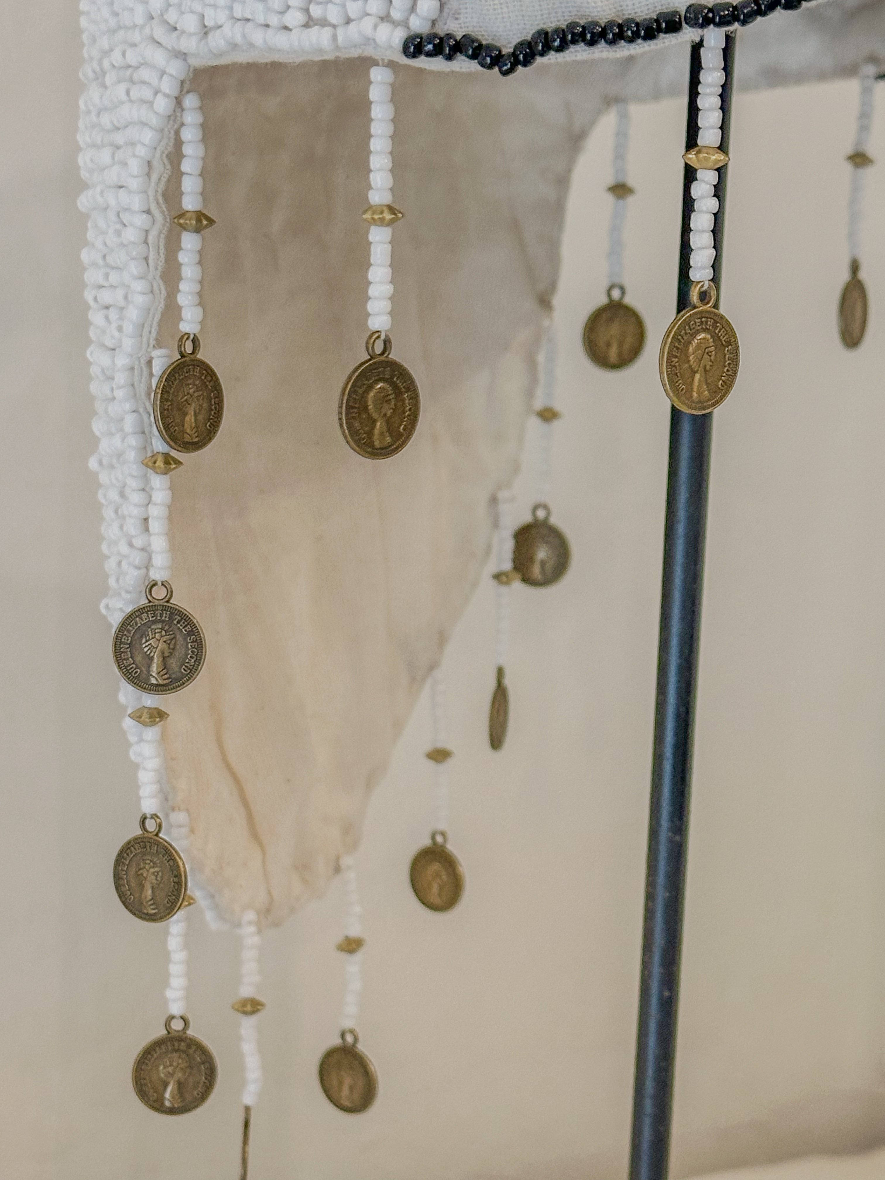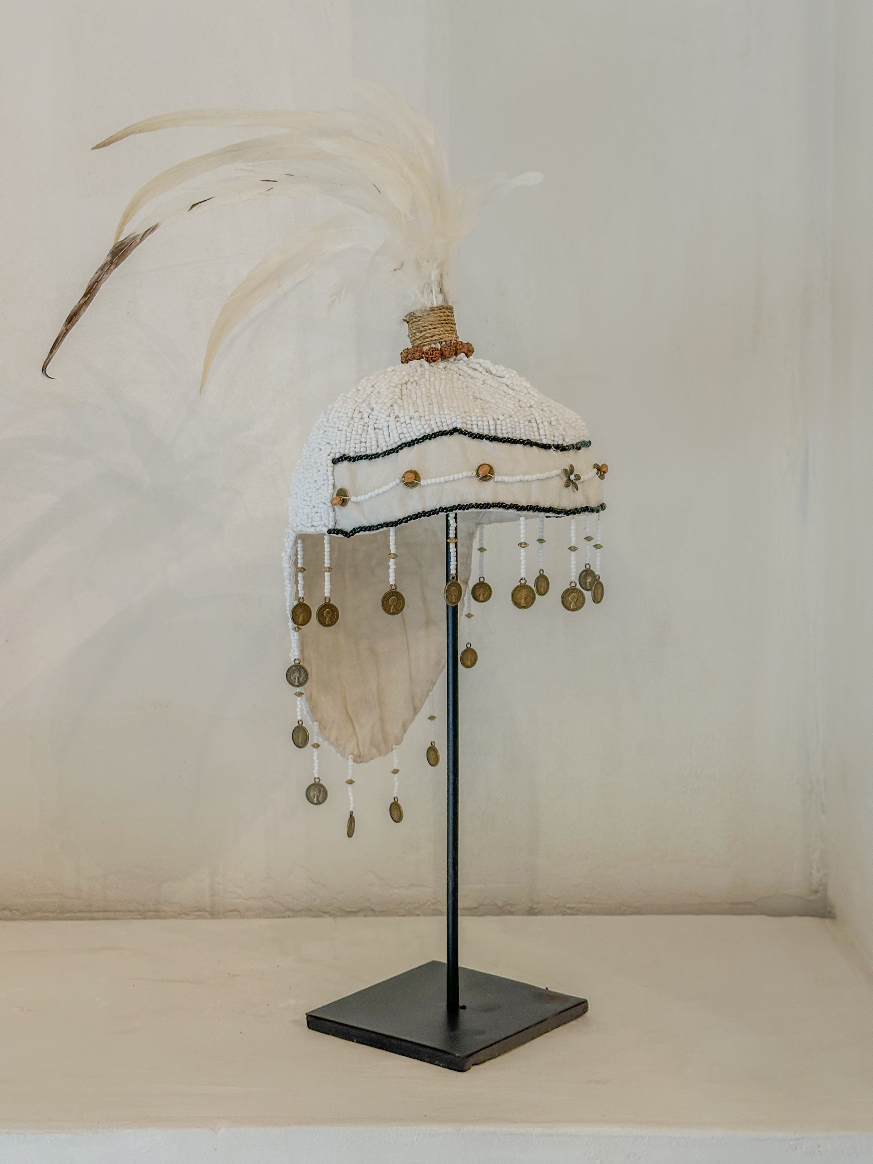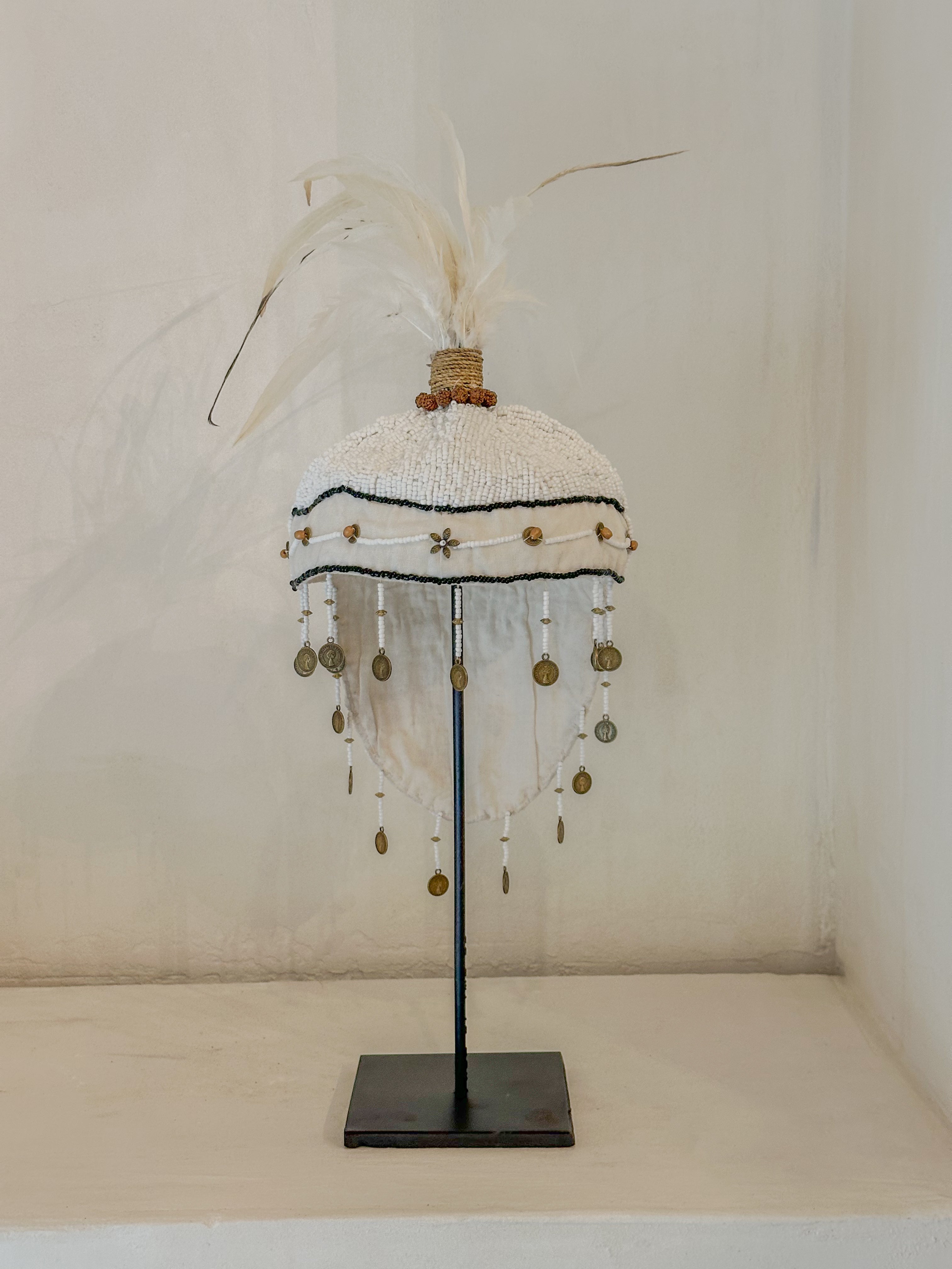 De lichte veren bovenop geven het stuk een sierlijke afwerking, terwijl de kralen en muntjes zachtjes bewegen voor een speels effect. Het geheel is geborduurd en ambachtelijk vervaardigd, waardoor elk exemplaar uniek is.