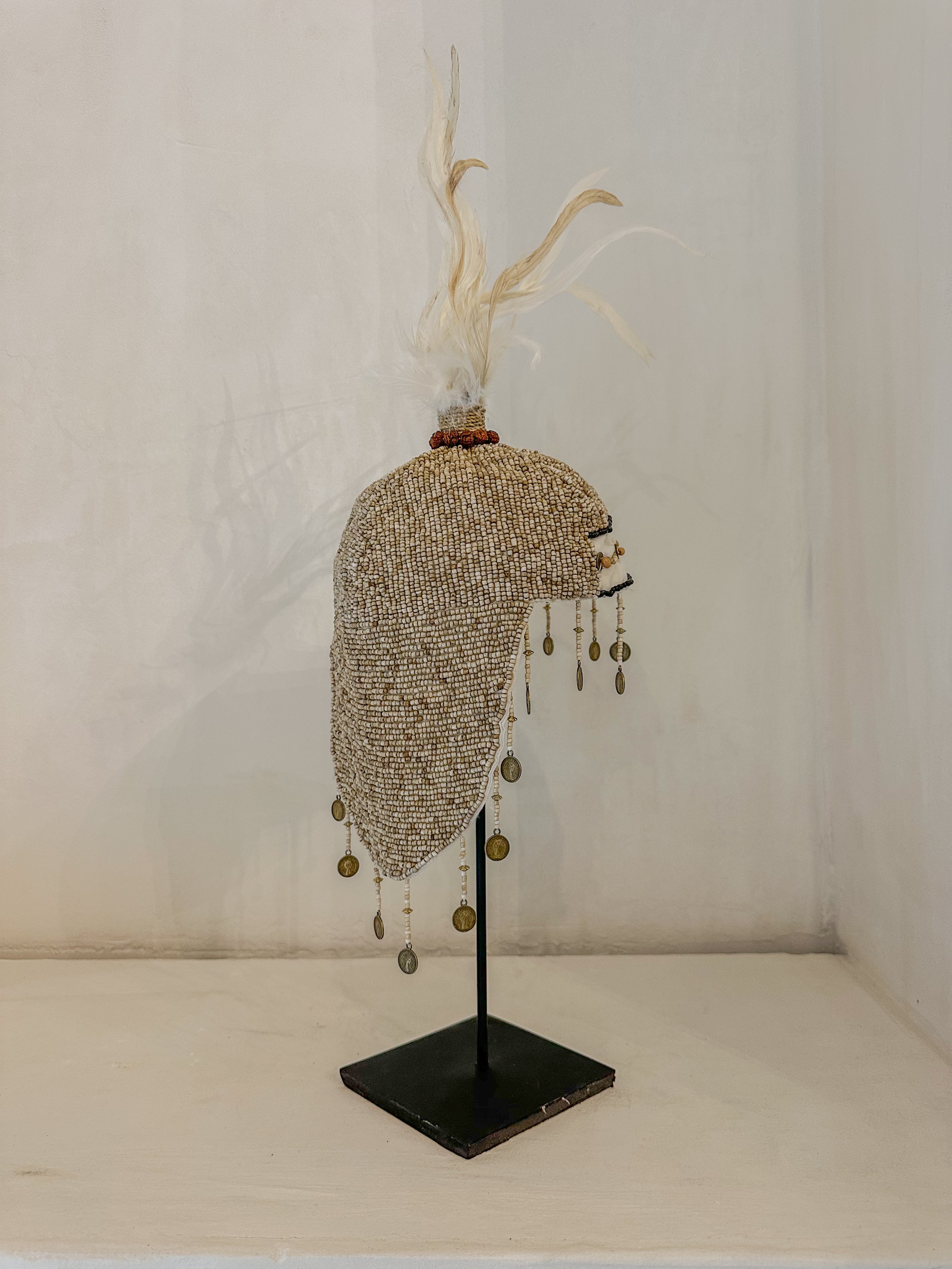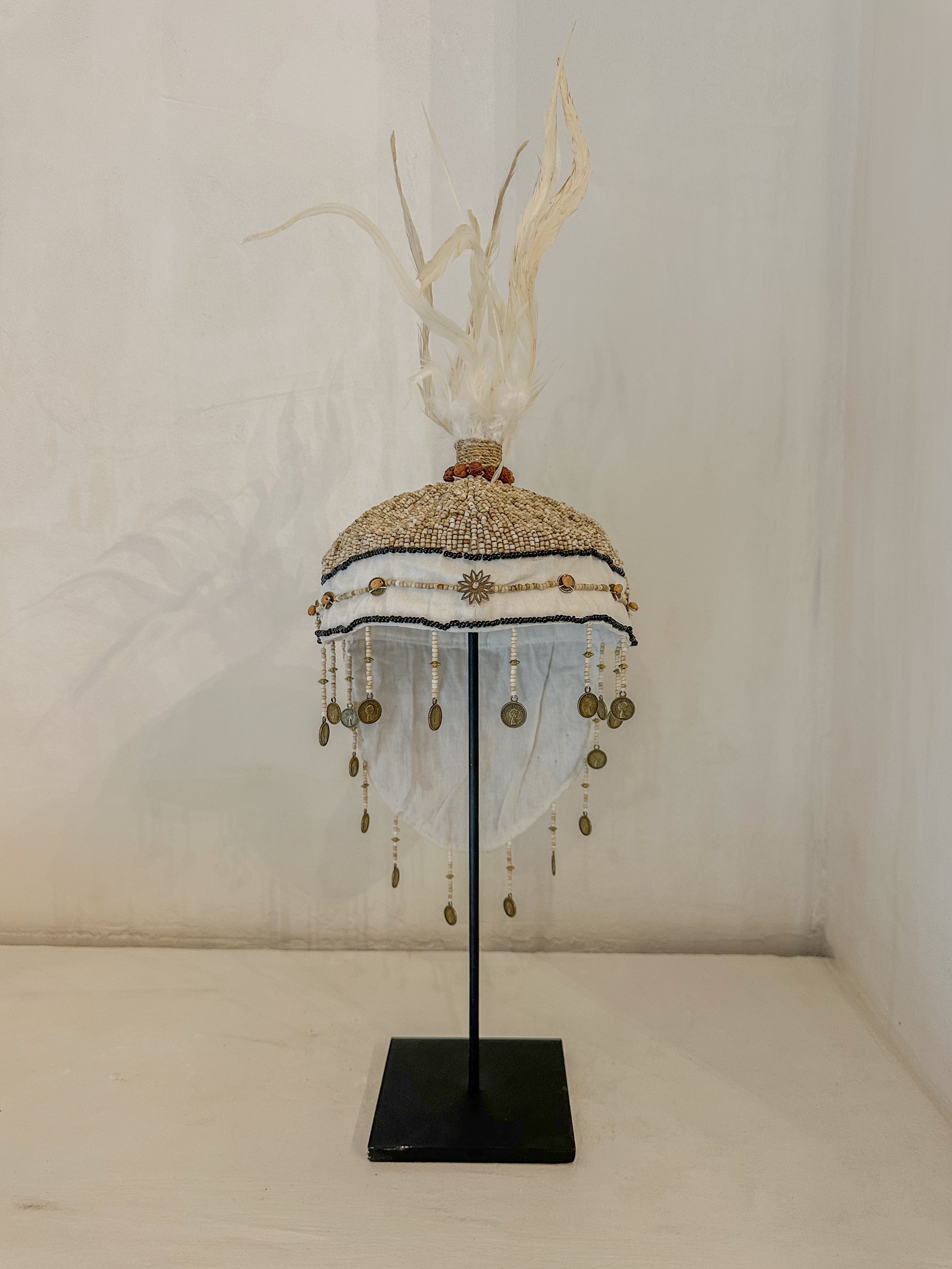 De hoofdtooi is volledig met de hand geborduurd en rijk gedecoreerd met metalen details en muntjes die zacht meebewegen. De lichte veren bovenop geven het geheel een sierlijke, luchtige afwerking.