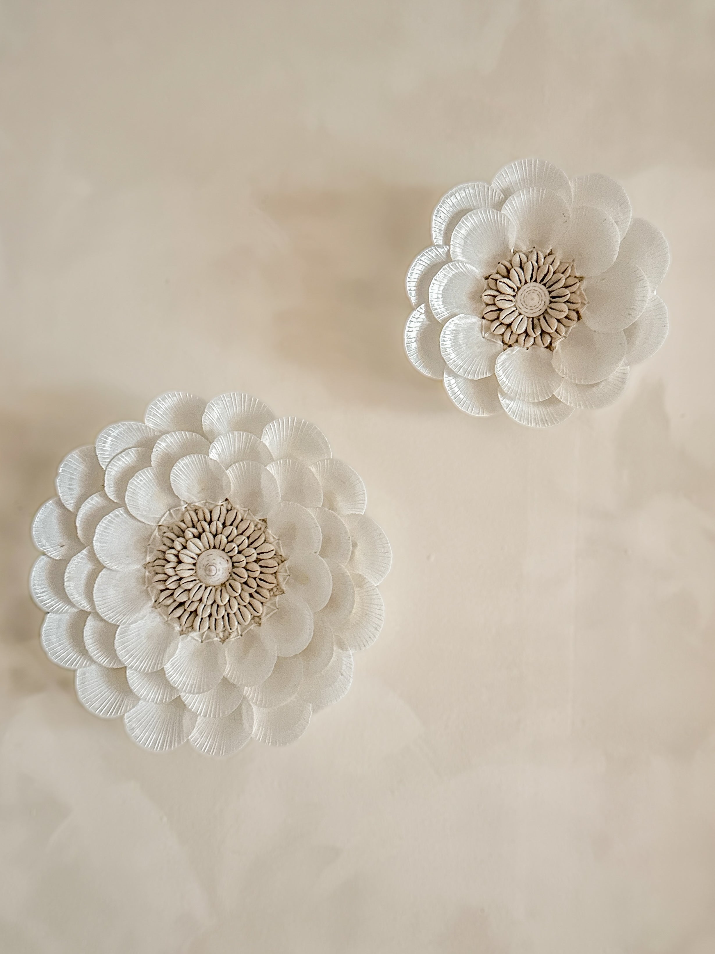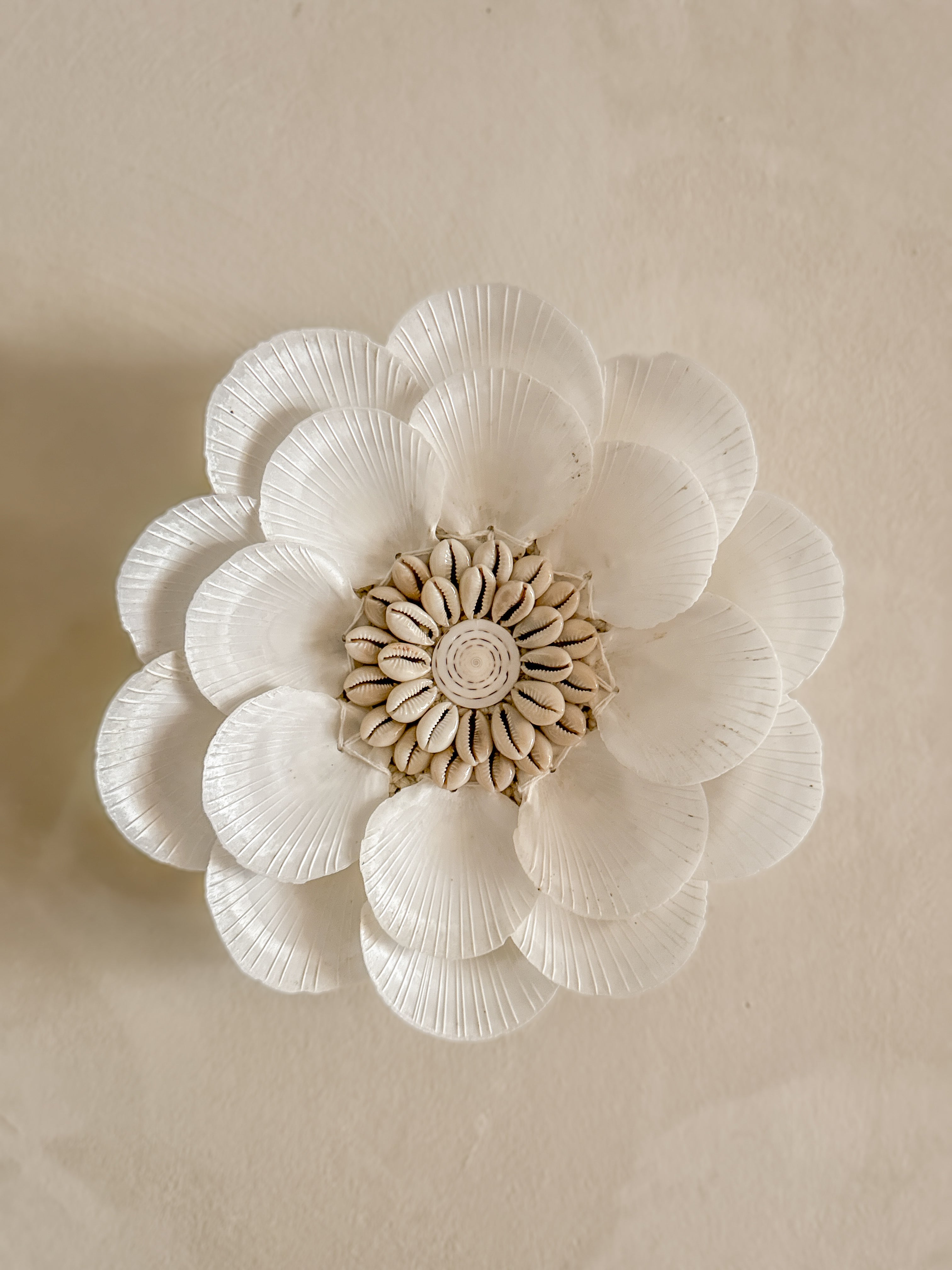 Deze handgemaakte wanddecoratie is vervaardigd uit echte schelpen, zorgvuldig gerangschikt in bloemvorm met een hart van kauri schelpen. De zachte witte tint en organische textuur maken dit stuk een subtiel maar opvallend accent in elk interieur.