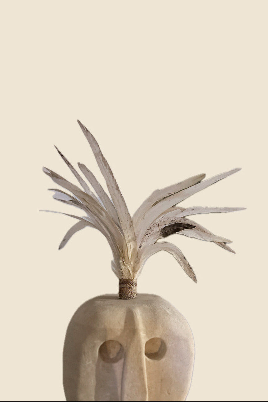 Met zijn minimalistische gezichtsvorm en decoratieve bloemmotieven aan de onderzijde straalt dit kunstwerk eenvoud, kracht en authenticiteit uit.