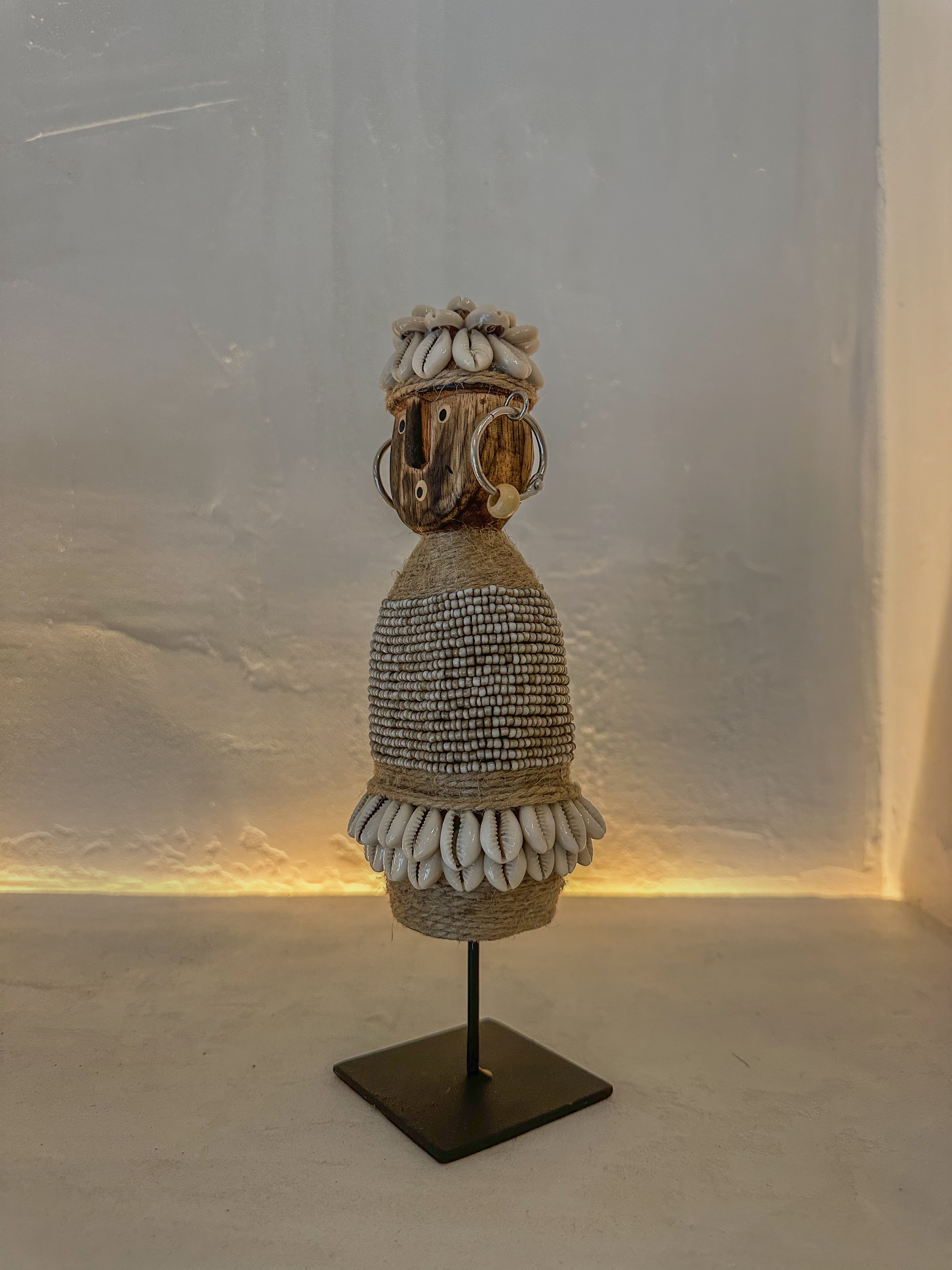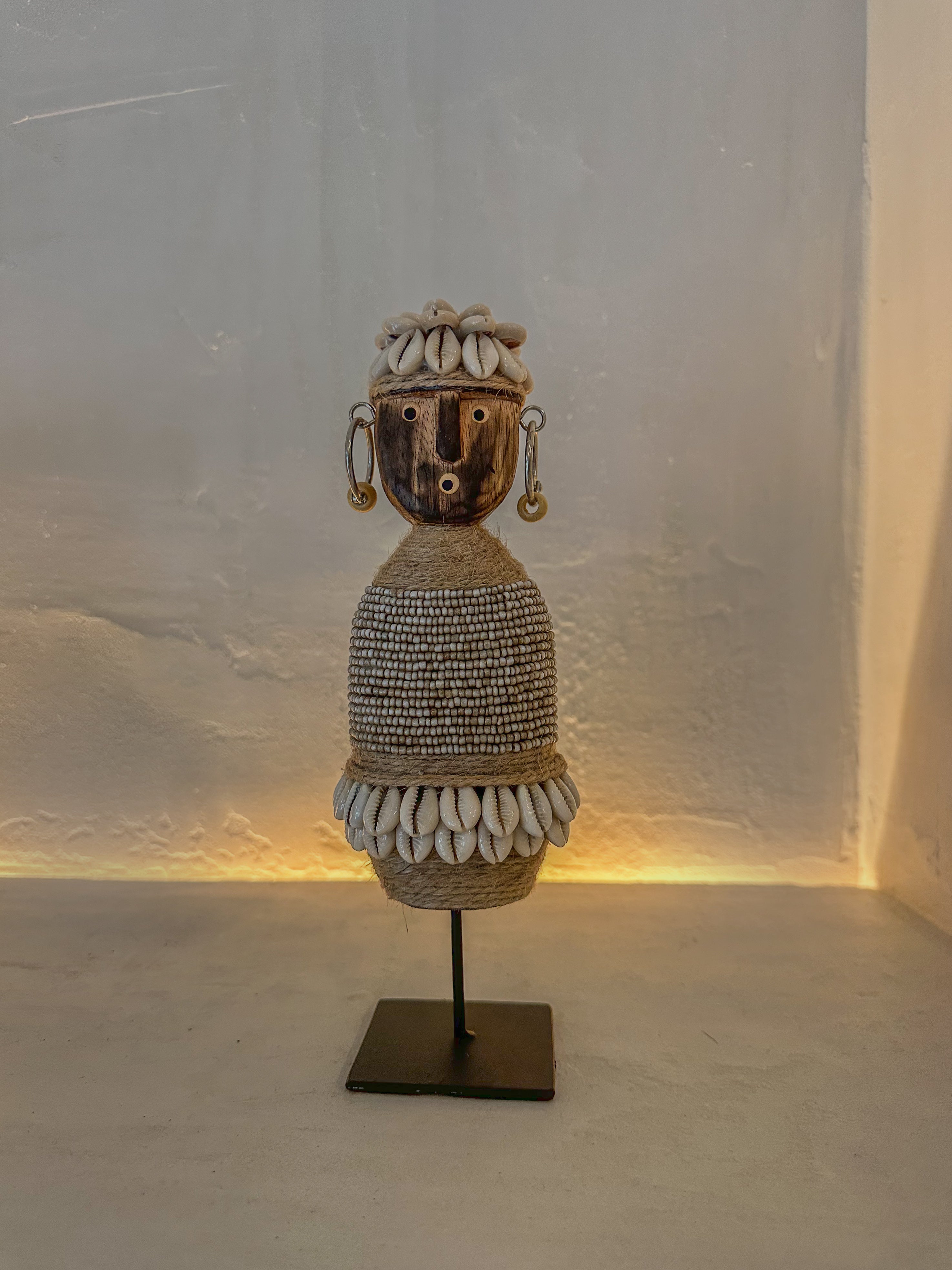 Het houten figuurtje is rijkelijk versierd met kleine beige glaskralen, natuurlijke kauri schelpen, jute touw en opvallende metalen oorbellen, wat zorgt voor een unieke etnische uitstraling.