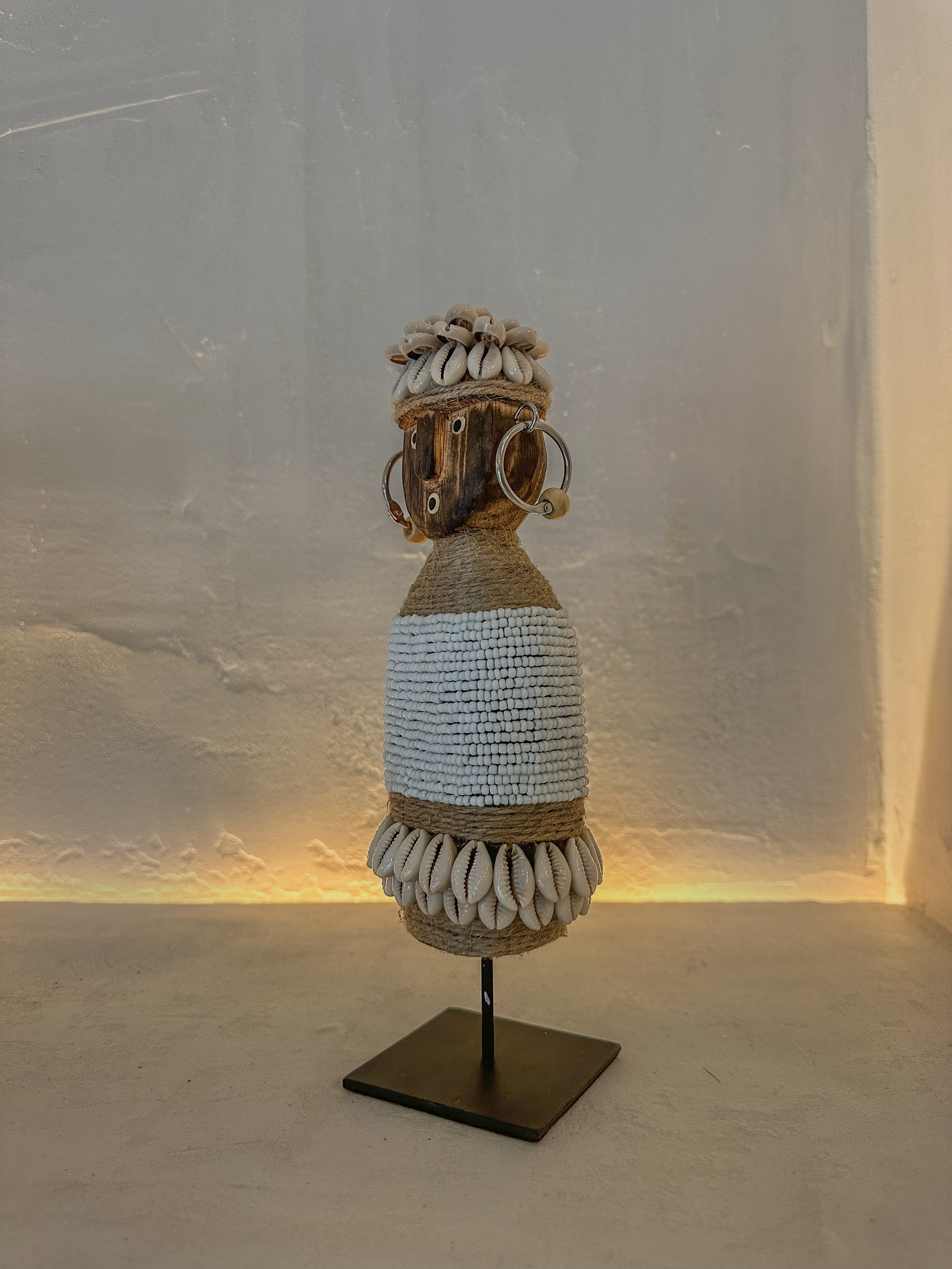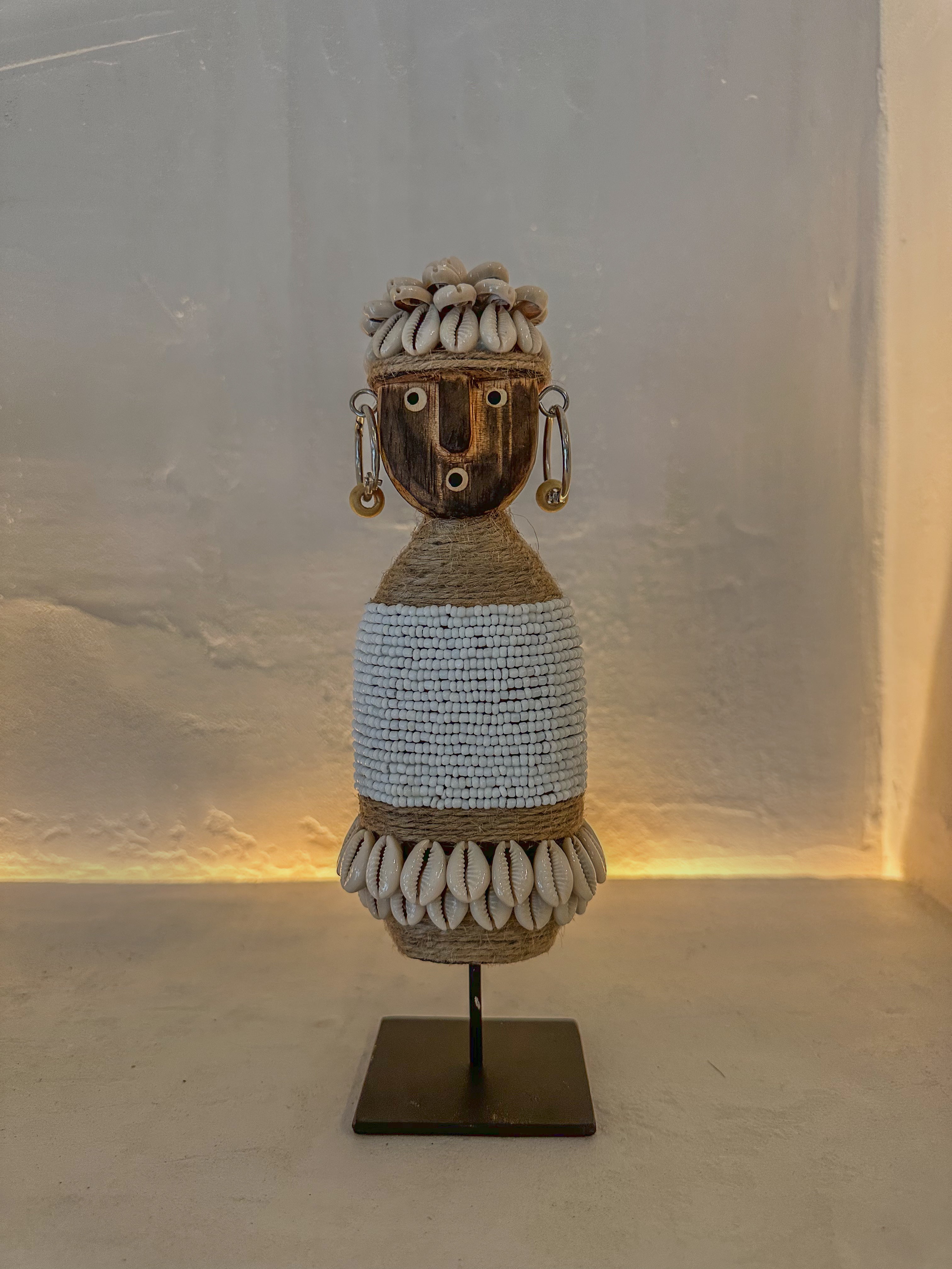 Het houten figuurtje is rijkelijk versierd met kleine witte glaskralen, natuurlijke kauri schelpen, jute touw en opvallende metalen oorbellen, wat zorgt voor een unieke etnische uitstraling.