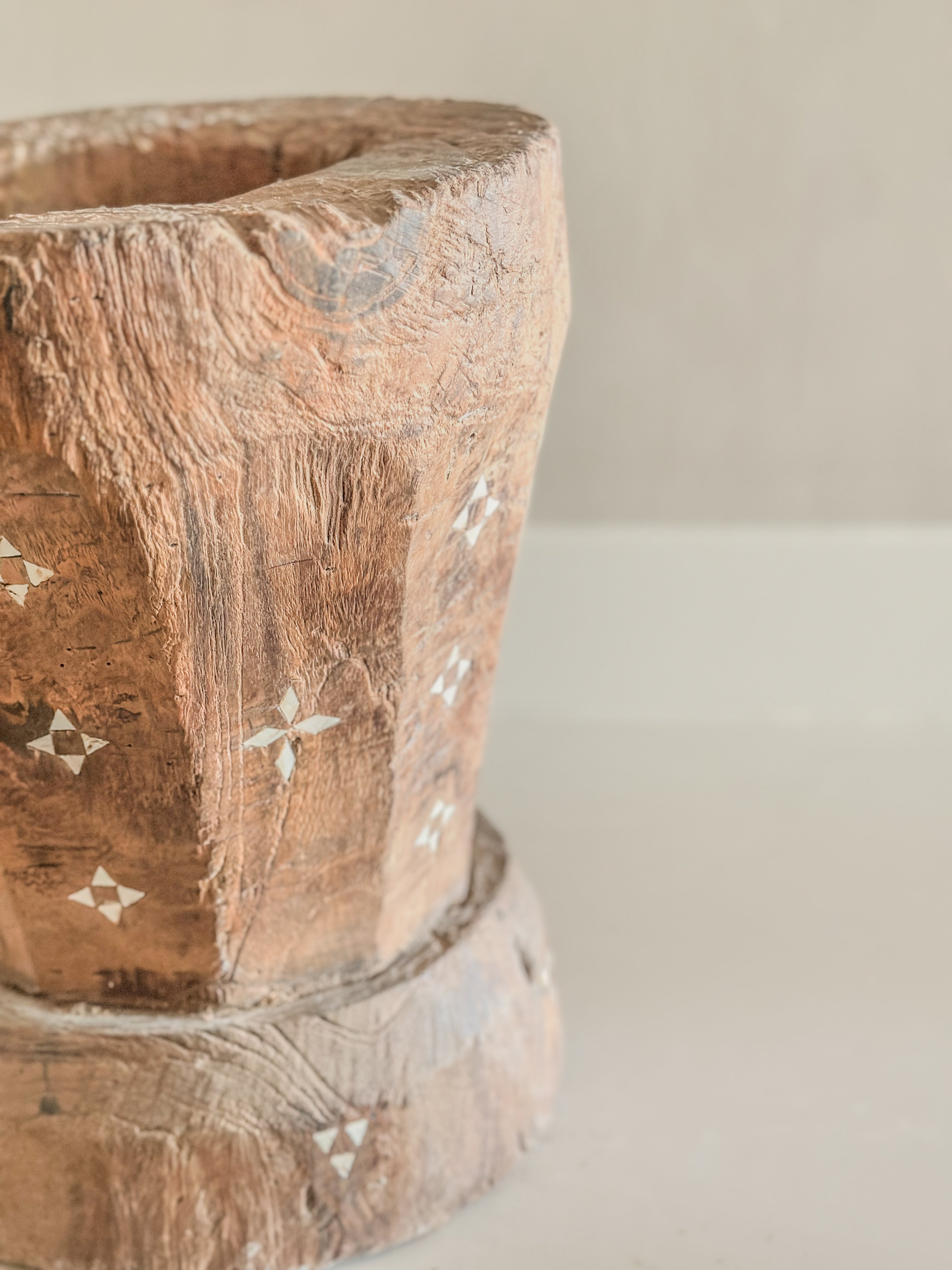 Deze bijzondere oude teak boomstam is een puur natuurproduct, waarin met de hand fijne parelmoerachtige schelpjes zijn ingelegd.