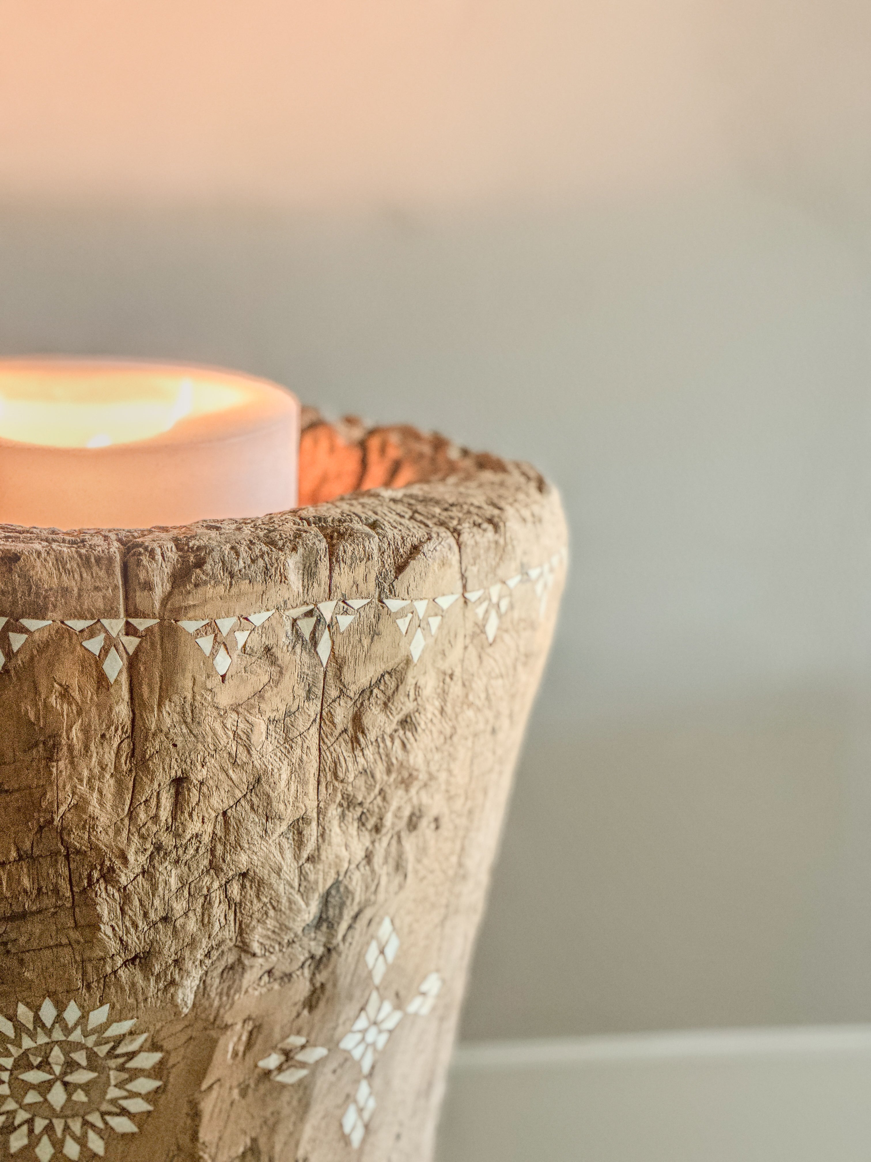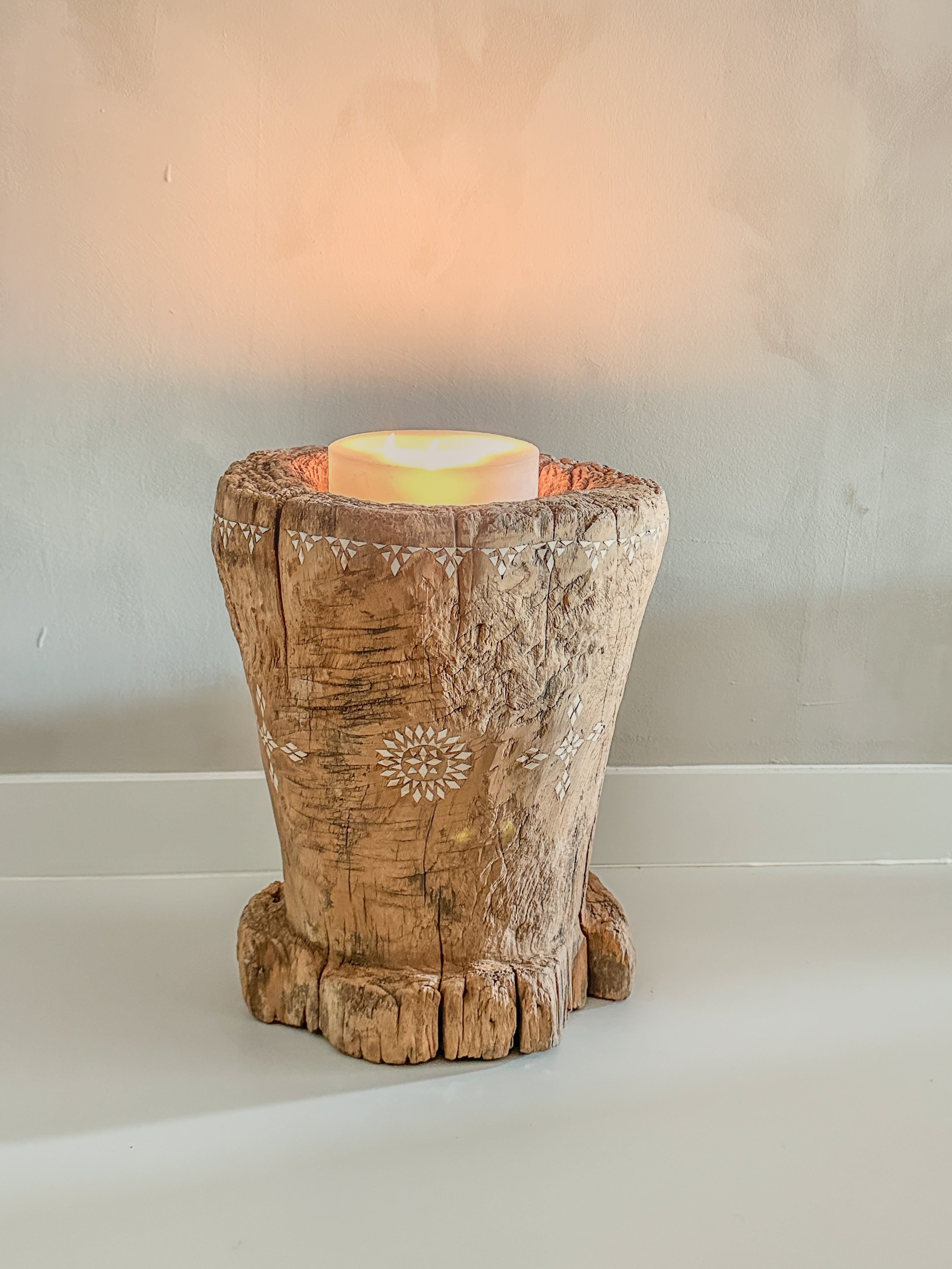 De natuurlijke holte bovenin is perfect om te gebruiken met een stompkaars, LED-kaars of een klein plantje, maar ook zonder toevoeging straalt dit stuk karakter en warmte uit.