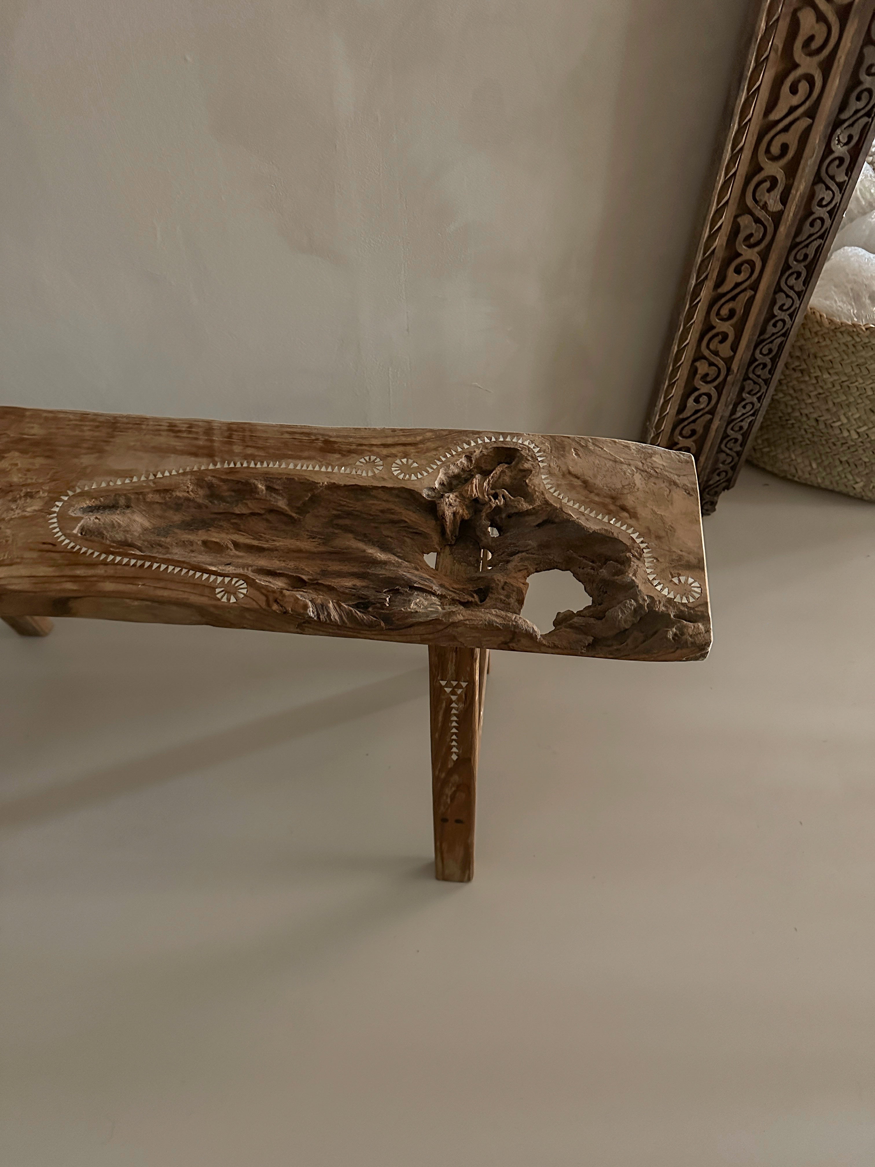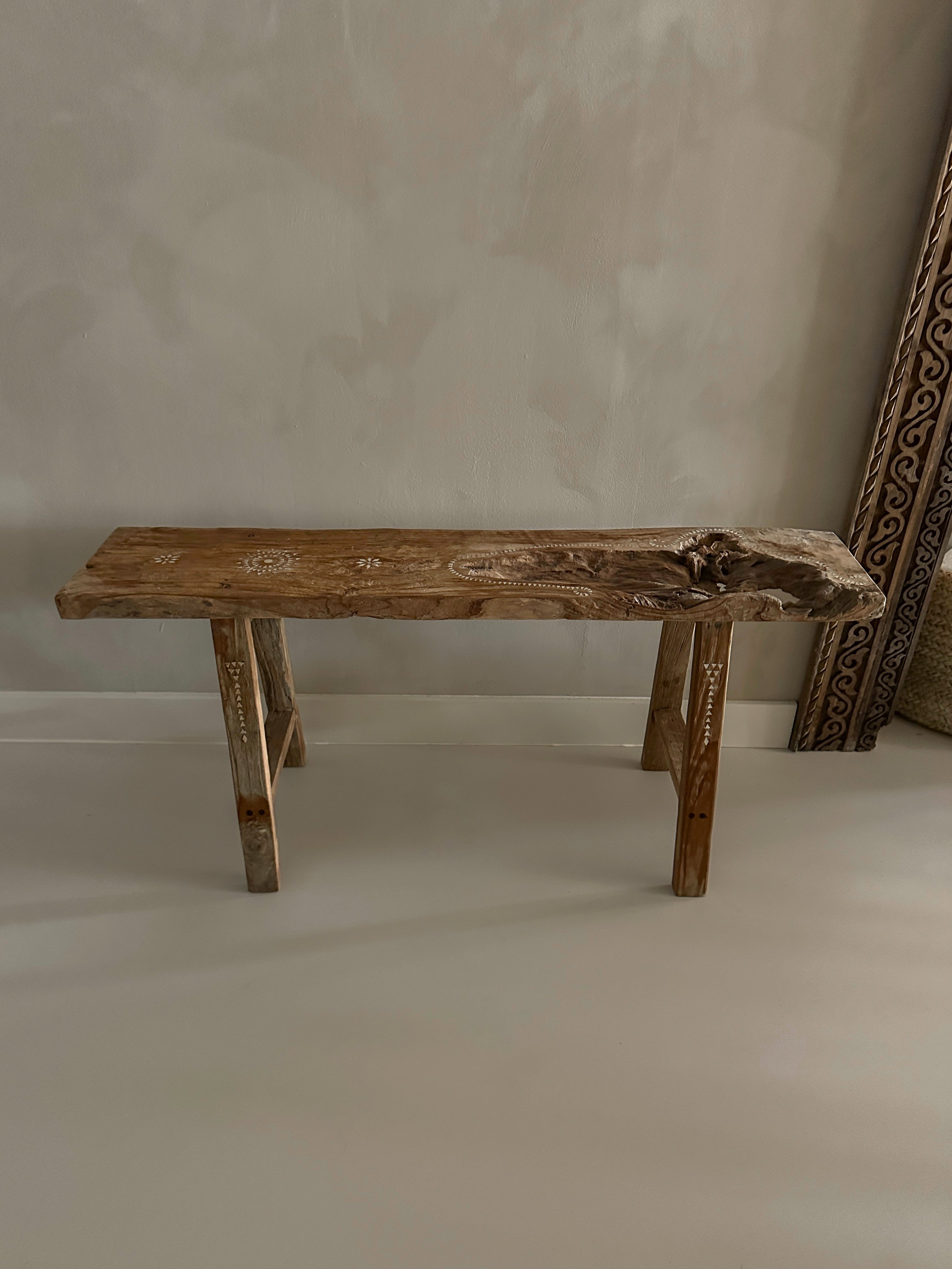 Dit prachtige houten bankje is handgemaakt van oud teak hout en versierd met subtiele ingelegde schelpjes in traditionele motieven.