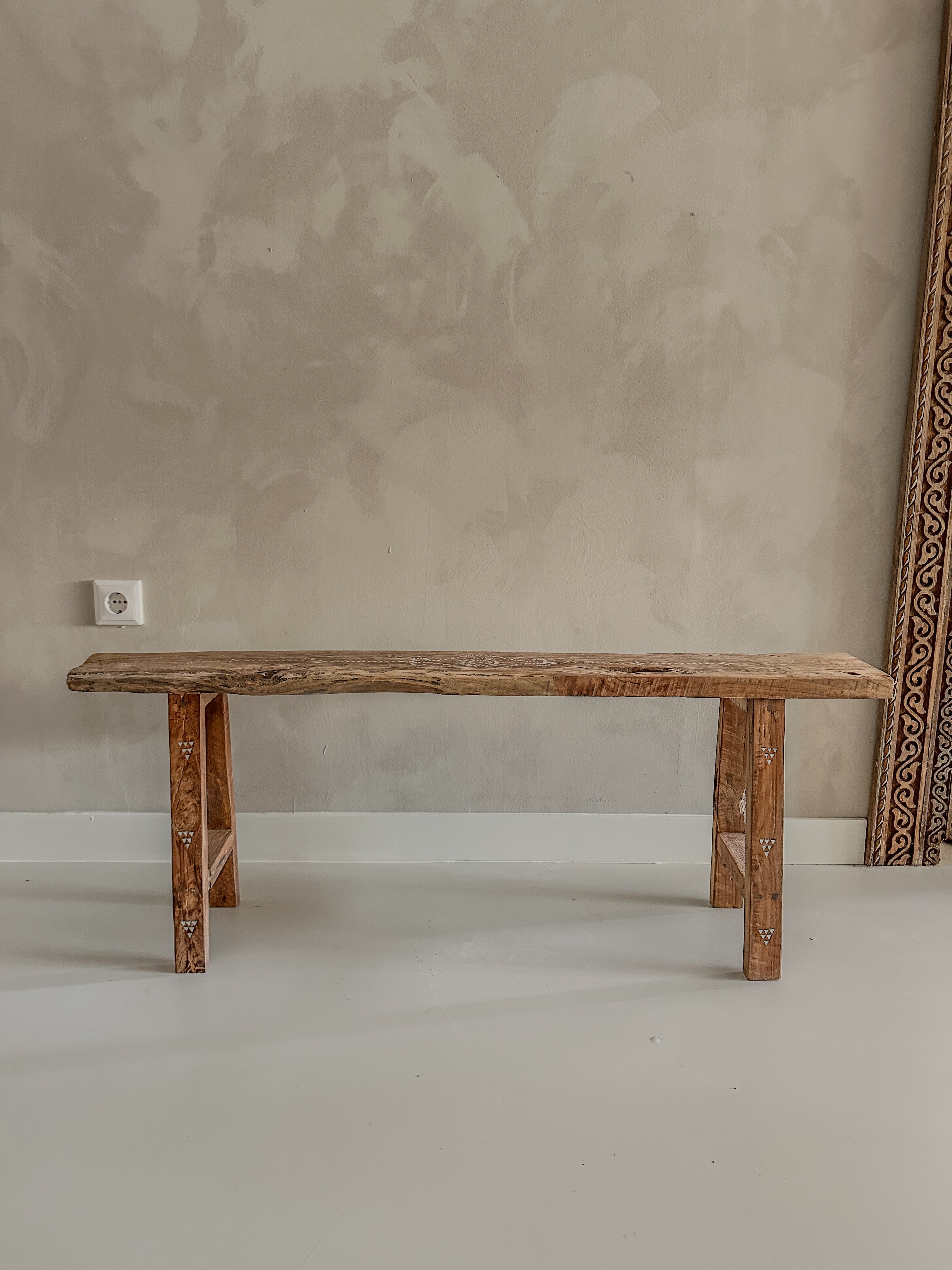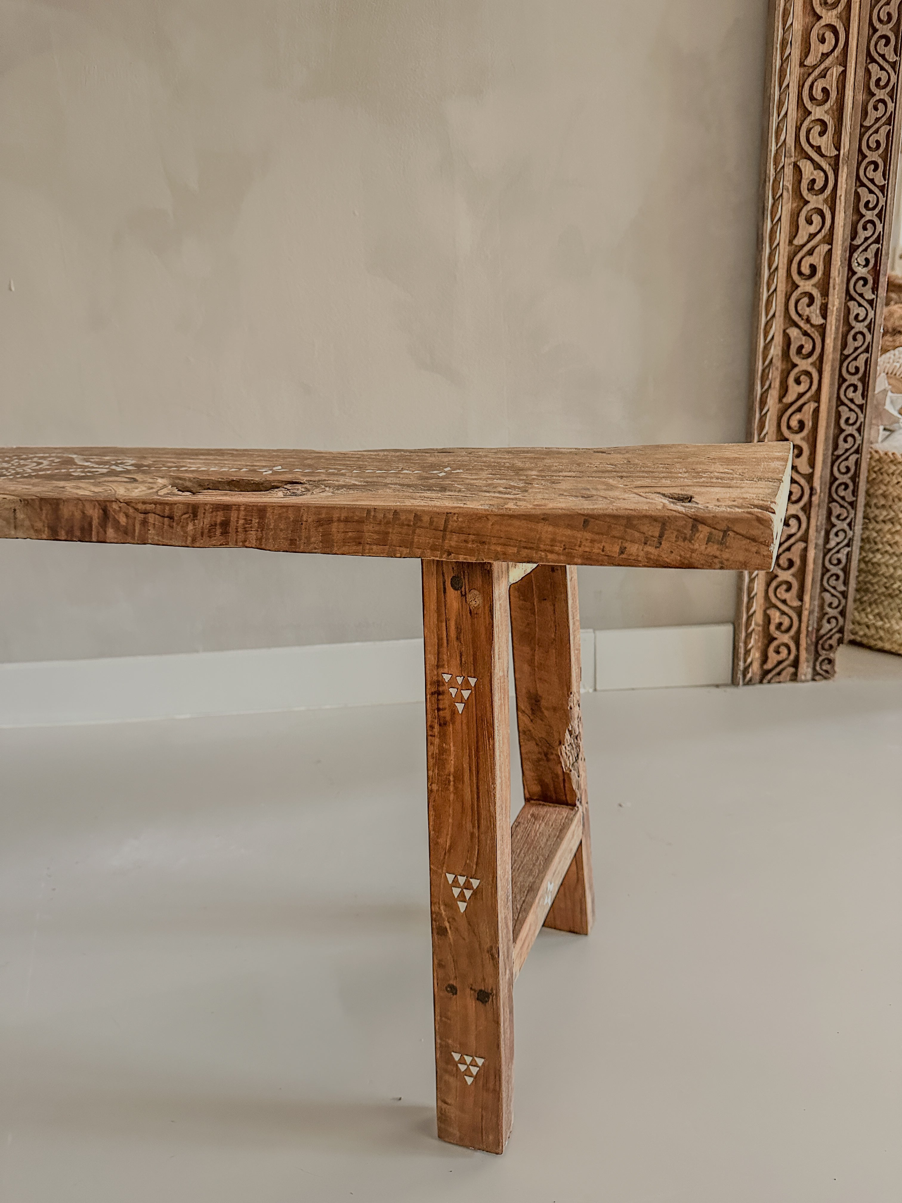 Dit prachtige houten bankje is handgemaakt van oud teak hout en versierd met subtiele ingelegde schelpjes in traditionele motieven.