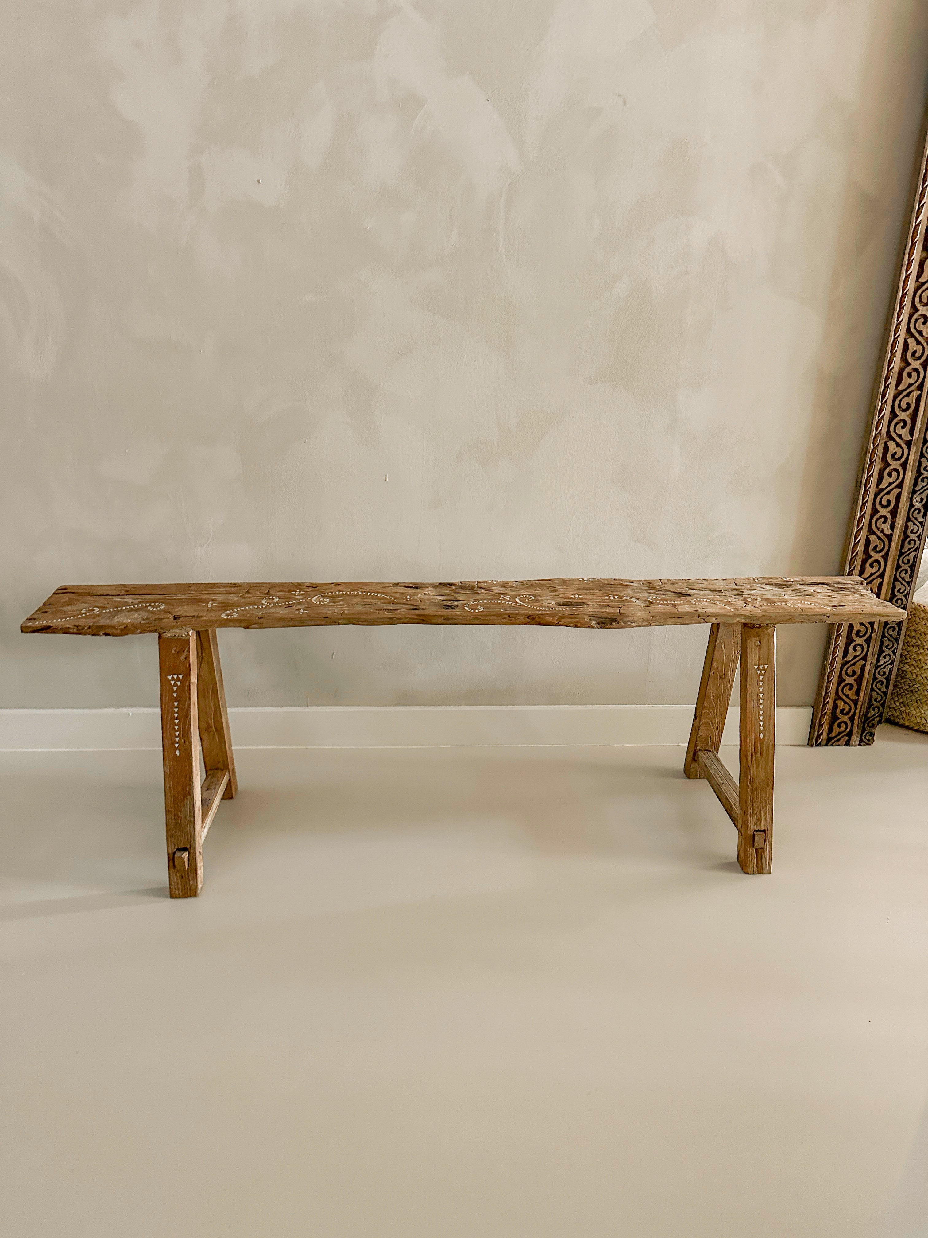 Dit prachtige houten bankje is handgemaakt van oud teak hout en versierd met subtiele ingelegde schelpjes in traditionele motieven.