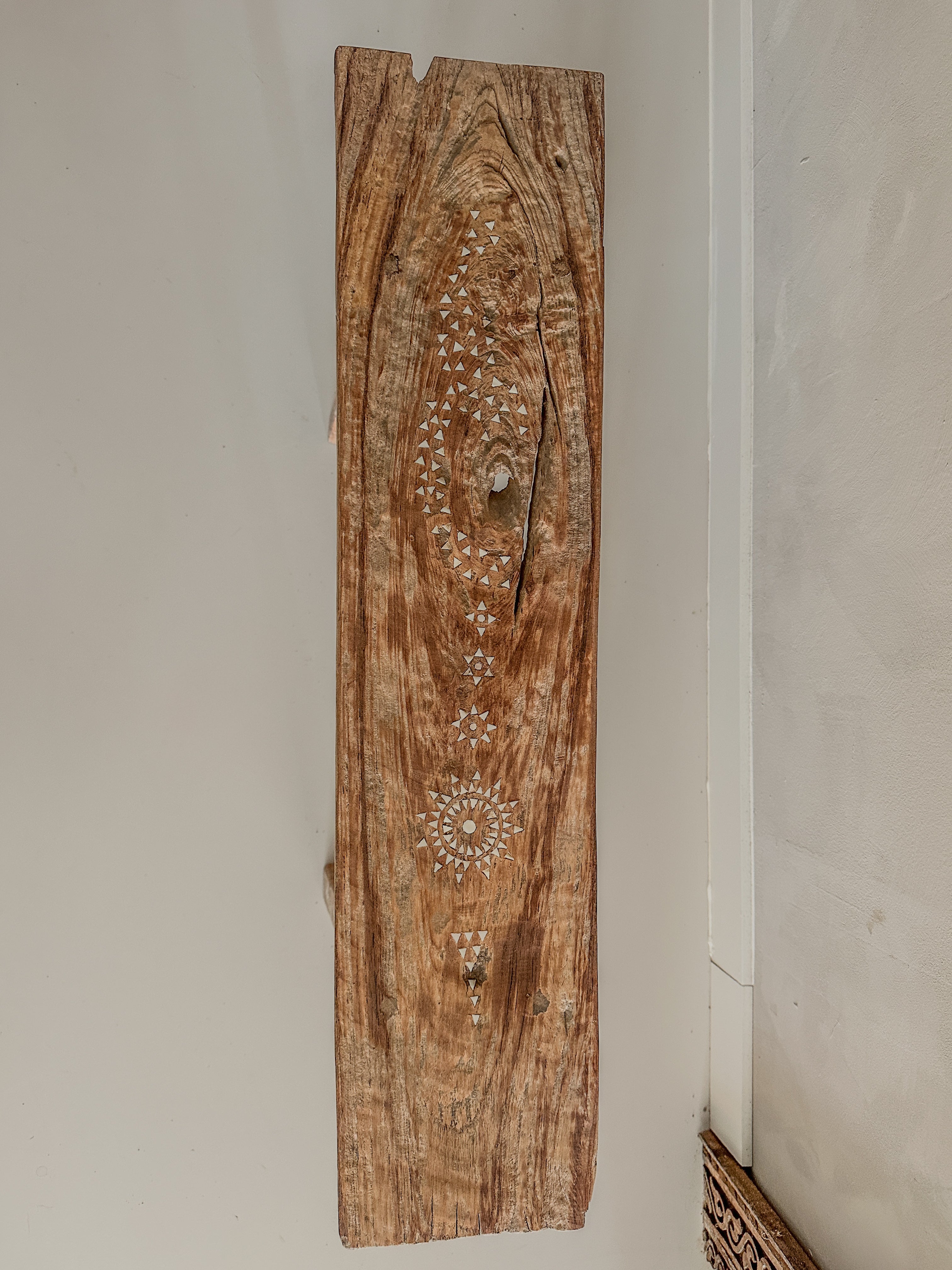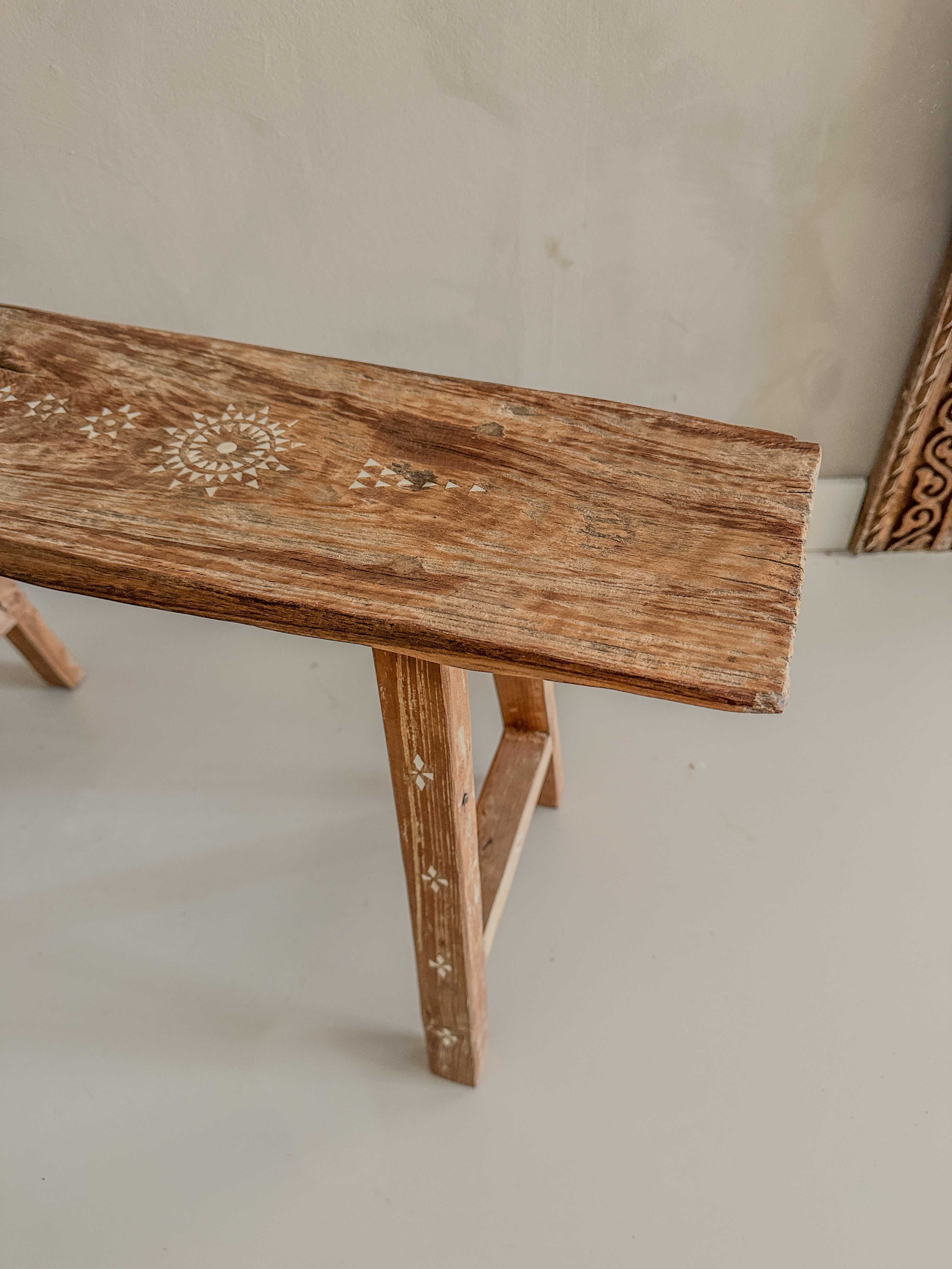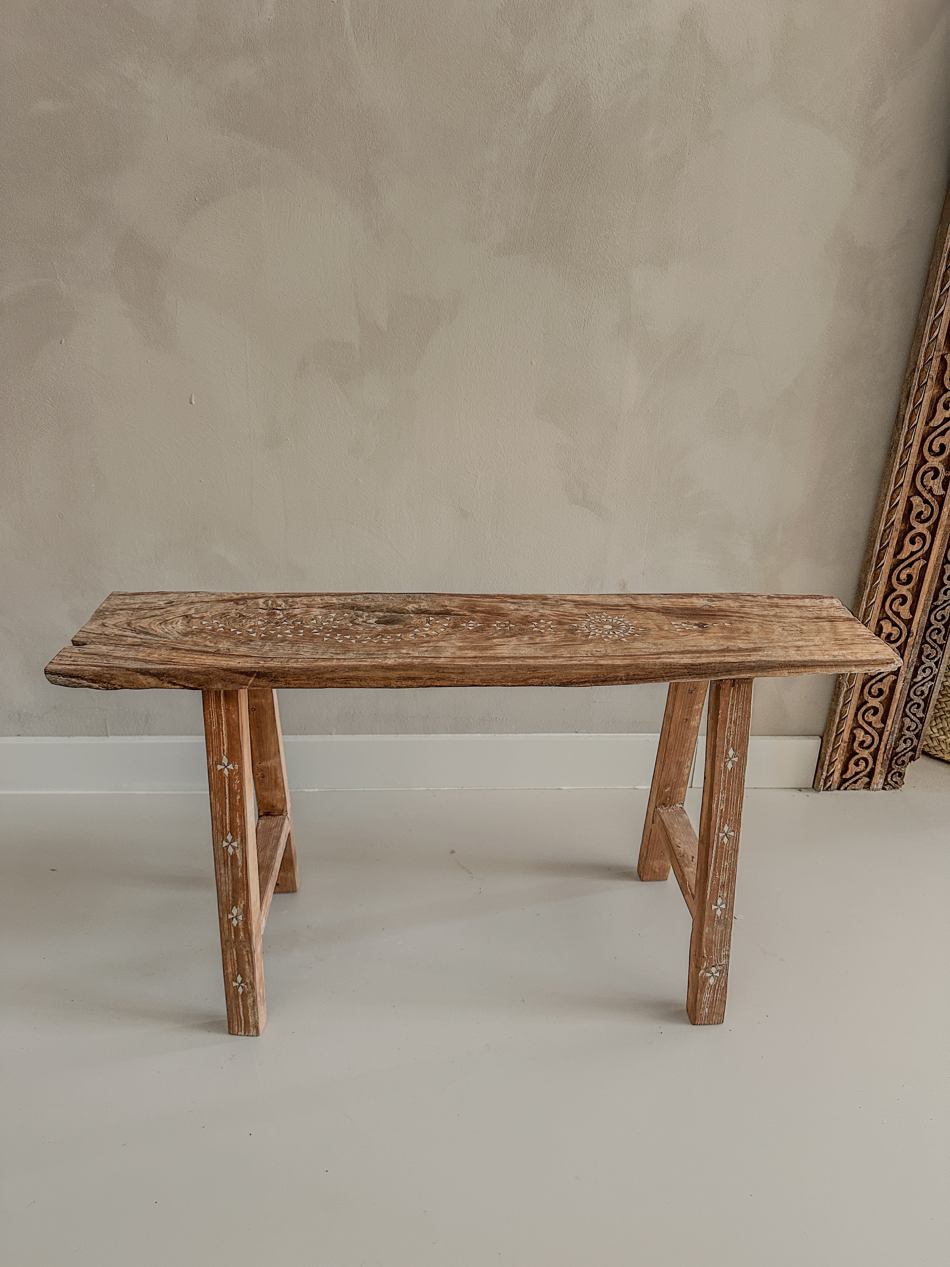 Dit prachtige houten bankje is handgemaakt van oud teak hout en versierd met subtiele ingelegde schelpjes in traditionele motieven.