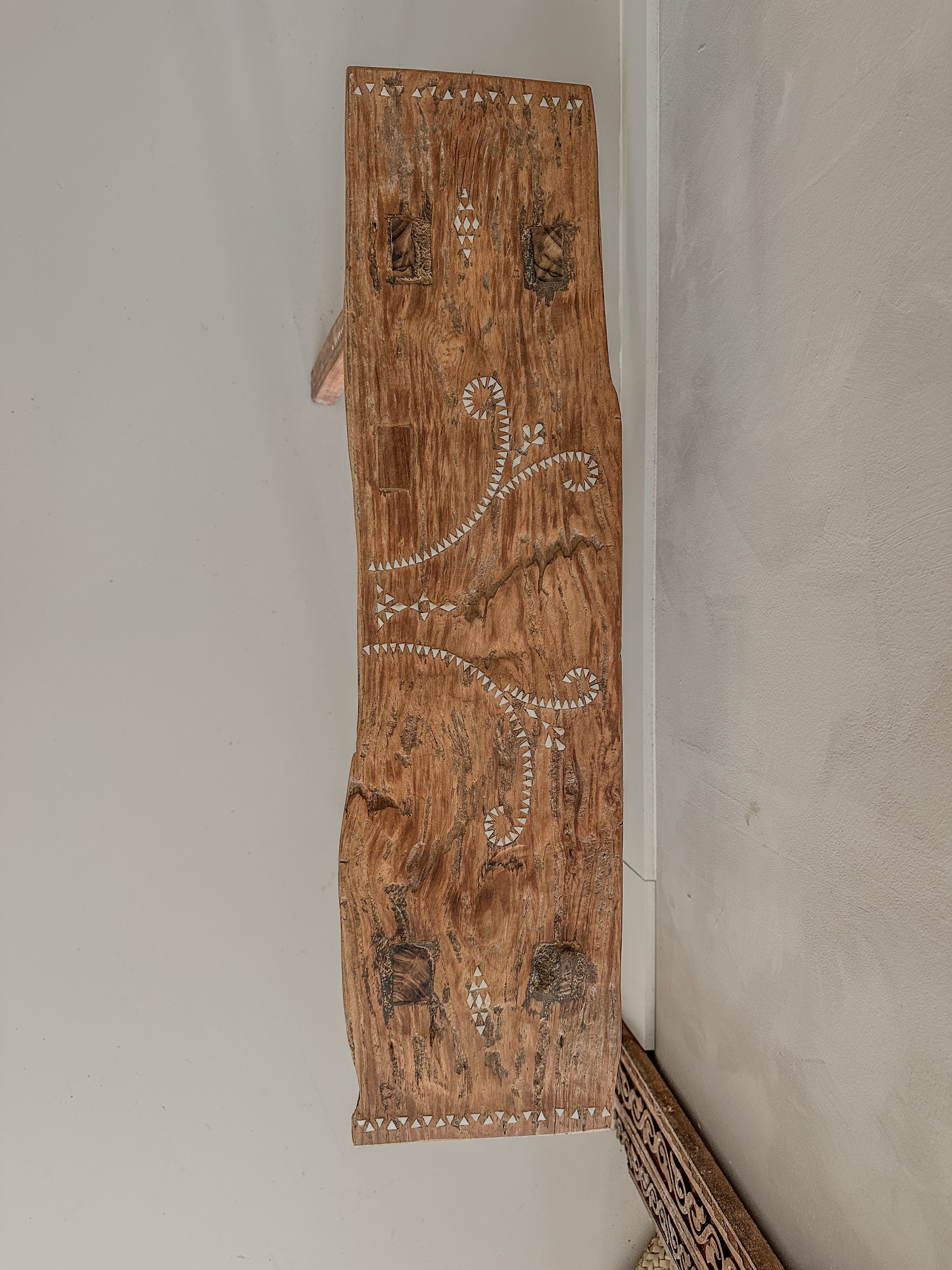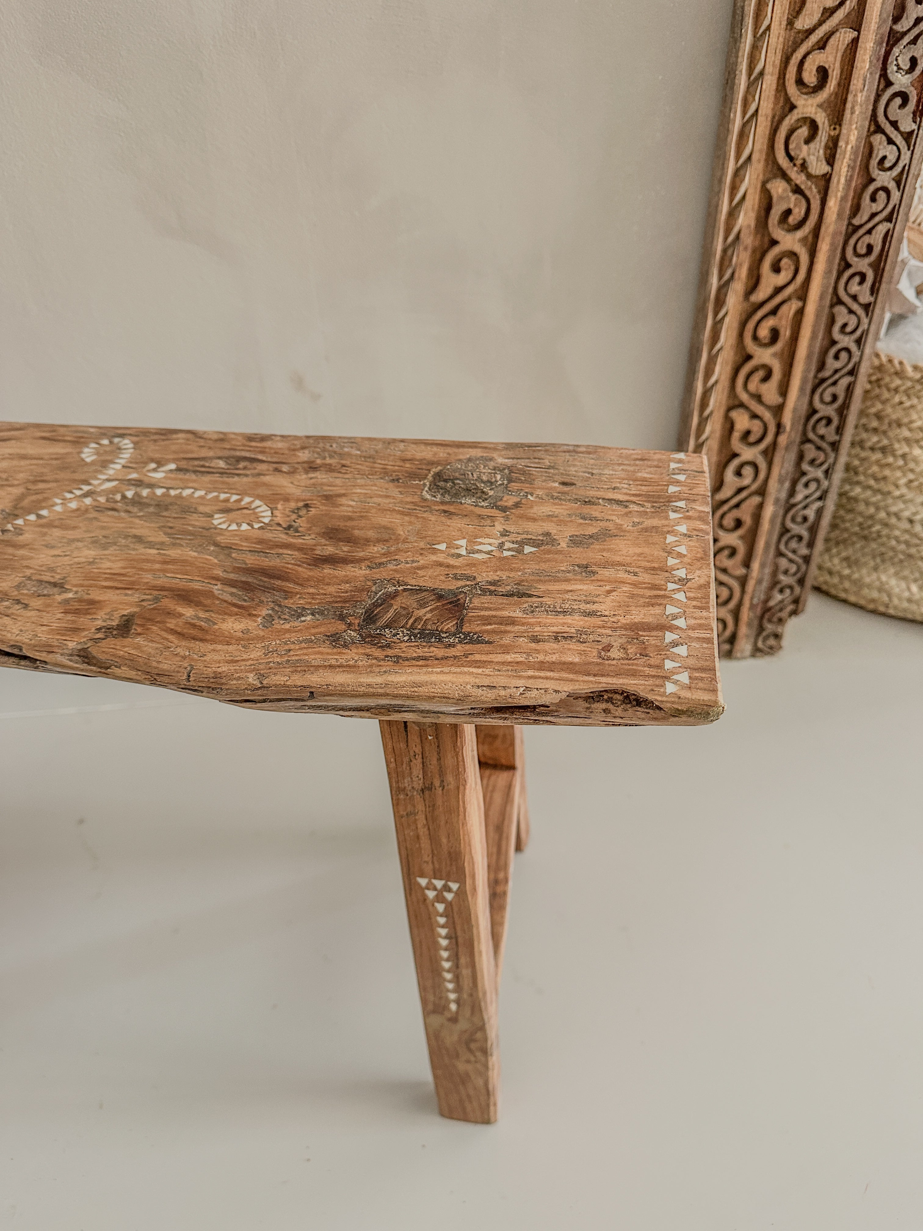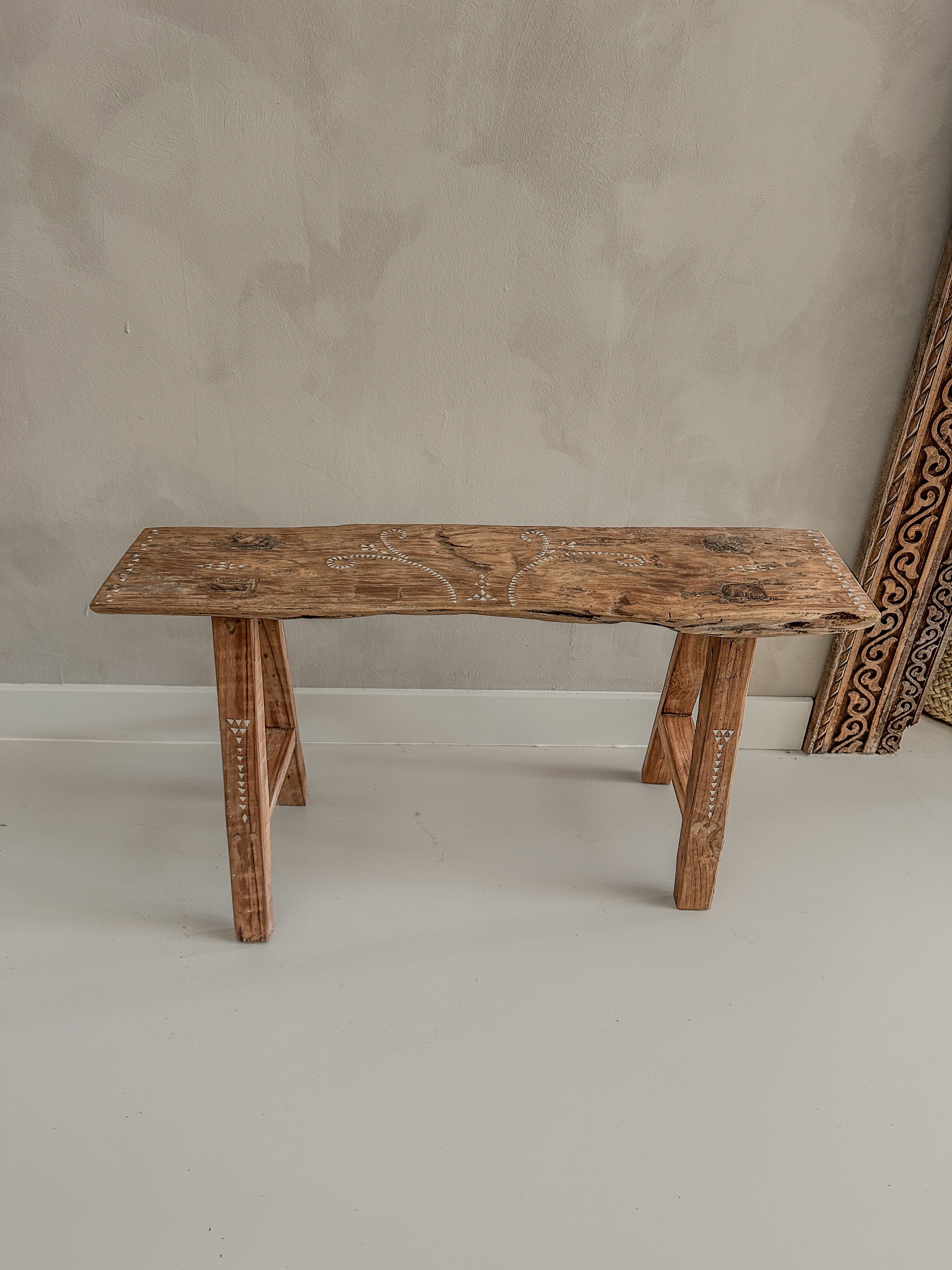 Dit prachtige houten bankje is handgemaakt van oud teak hout en versierd met subtiele ingelegde schelpjes in traditionele motieven.