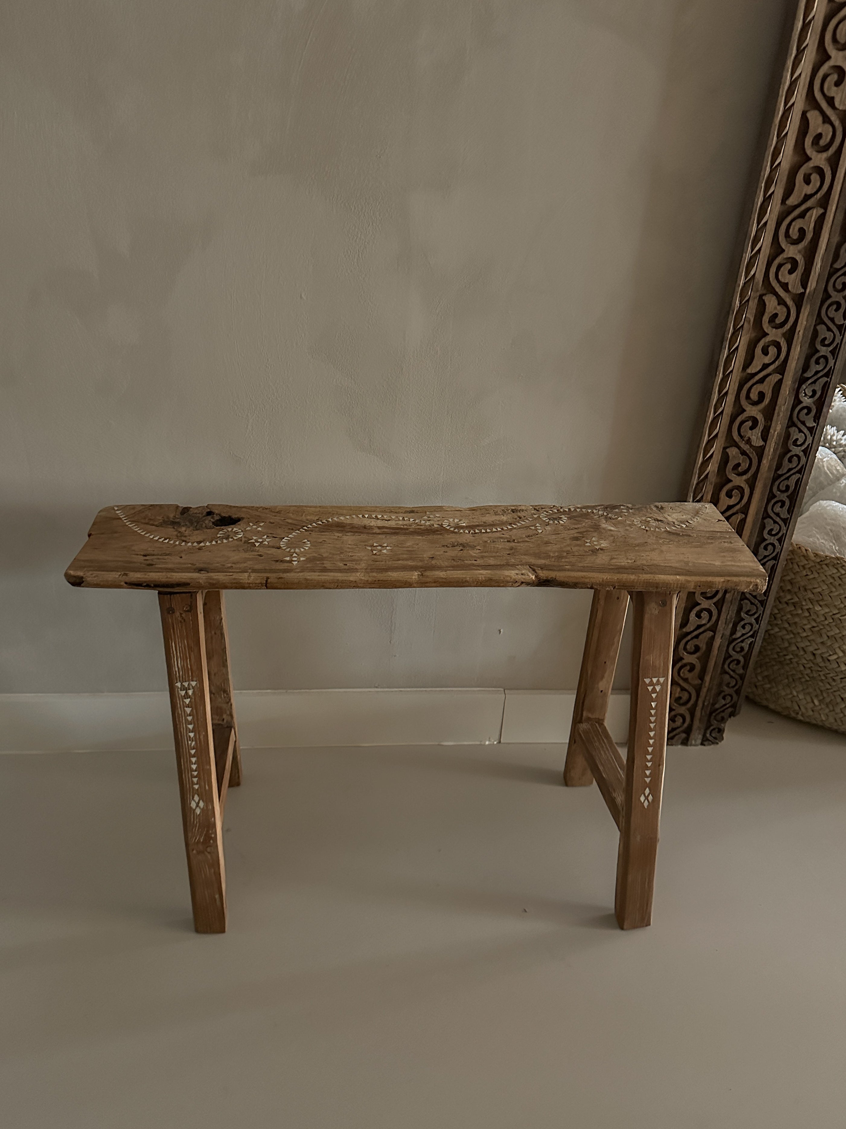 Dit prachtige houten bankje is handgemaakt van oud teak hout en versierd met subtiele ingelegde schelpjes in traditionele motieven. Elk...