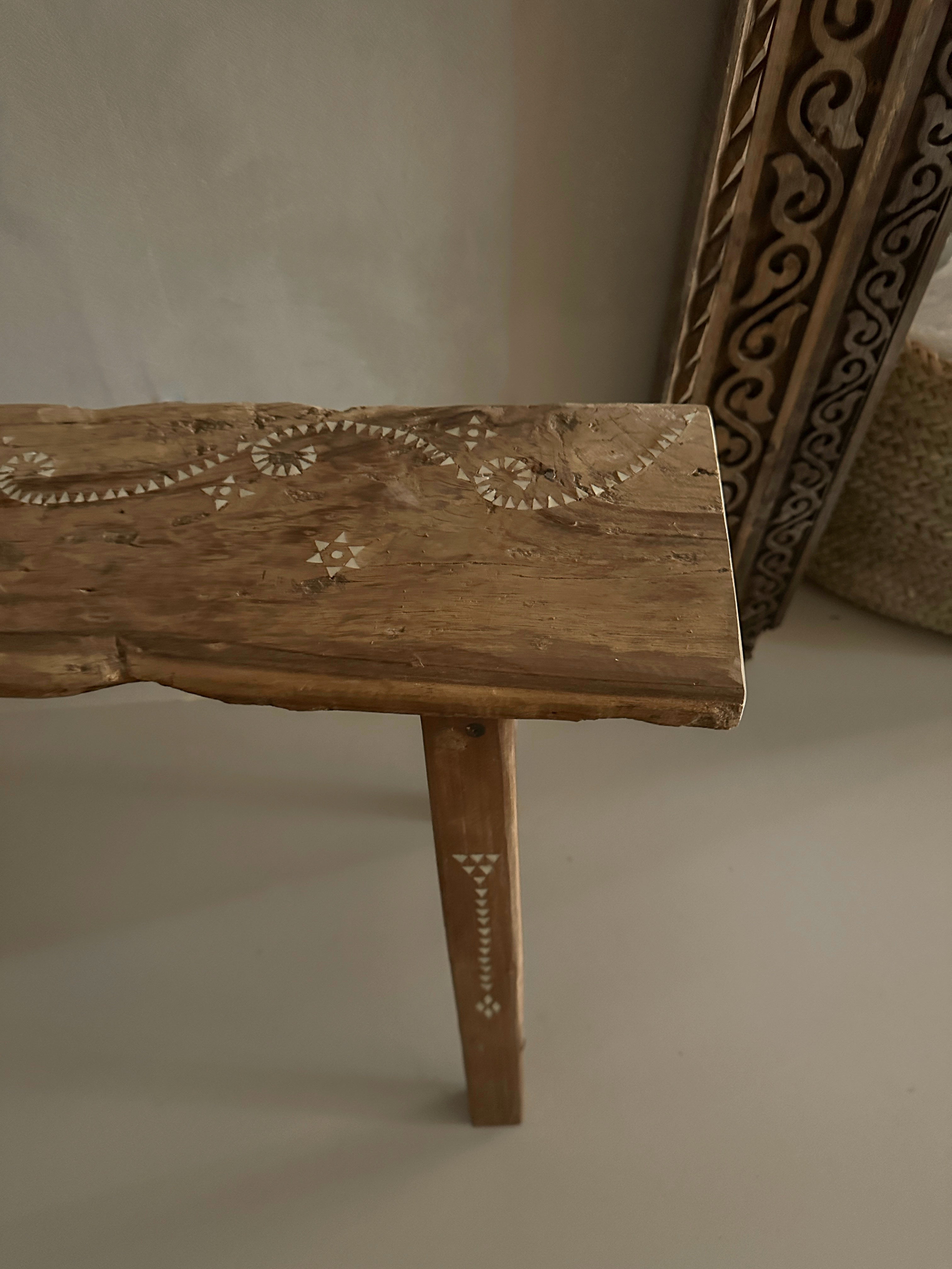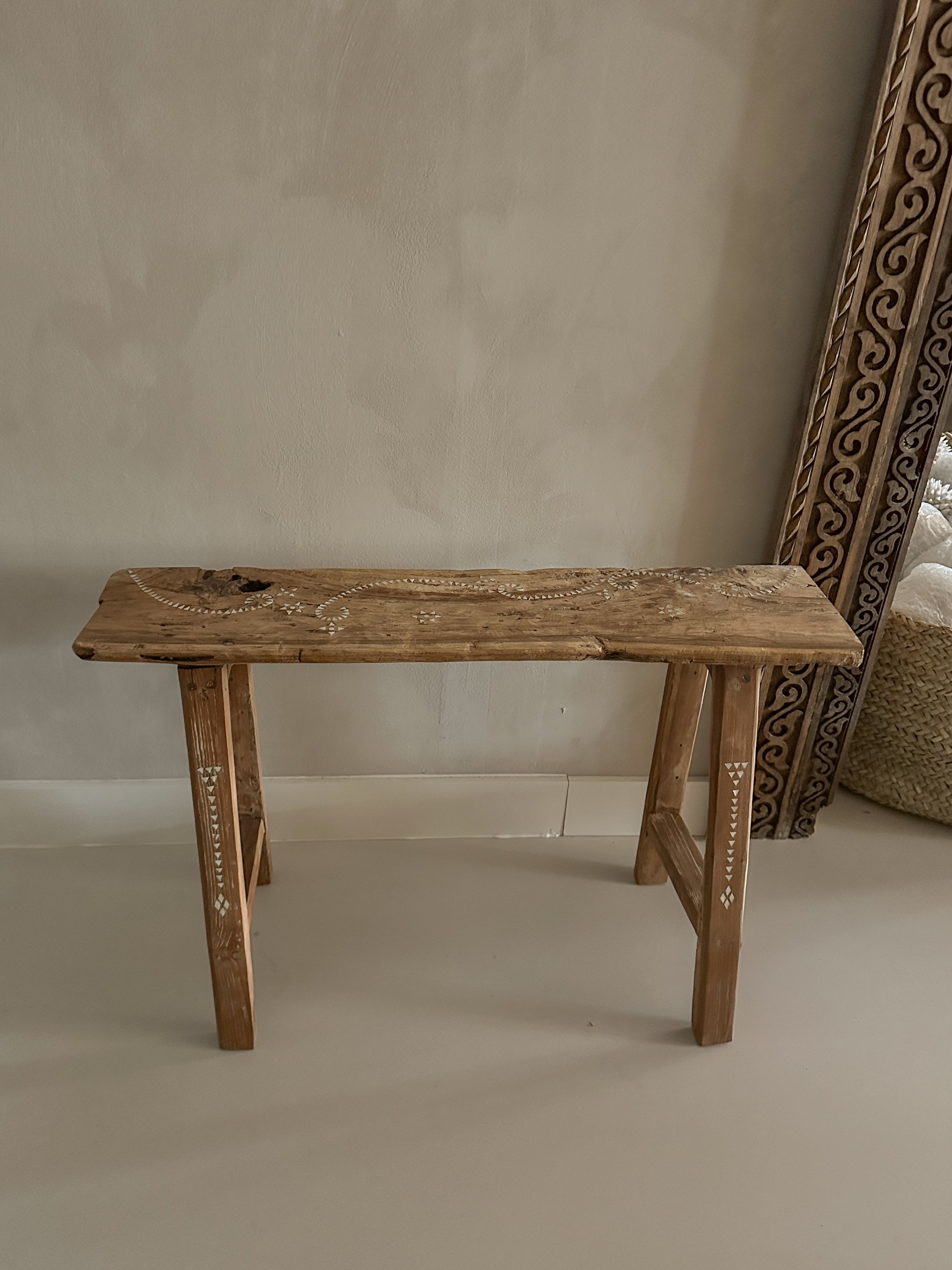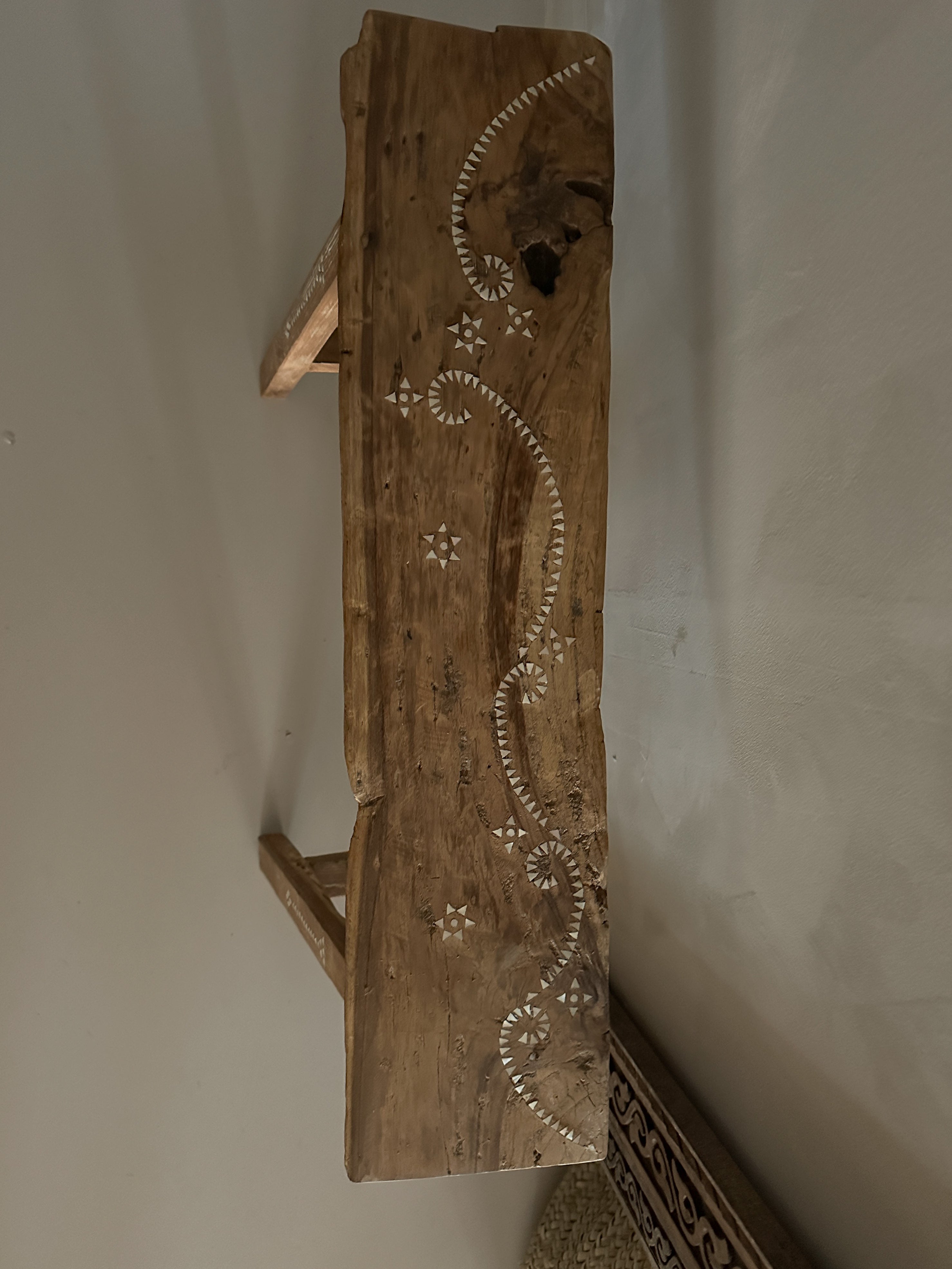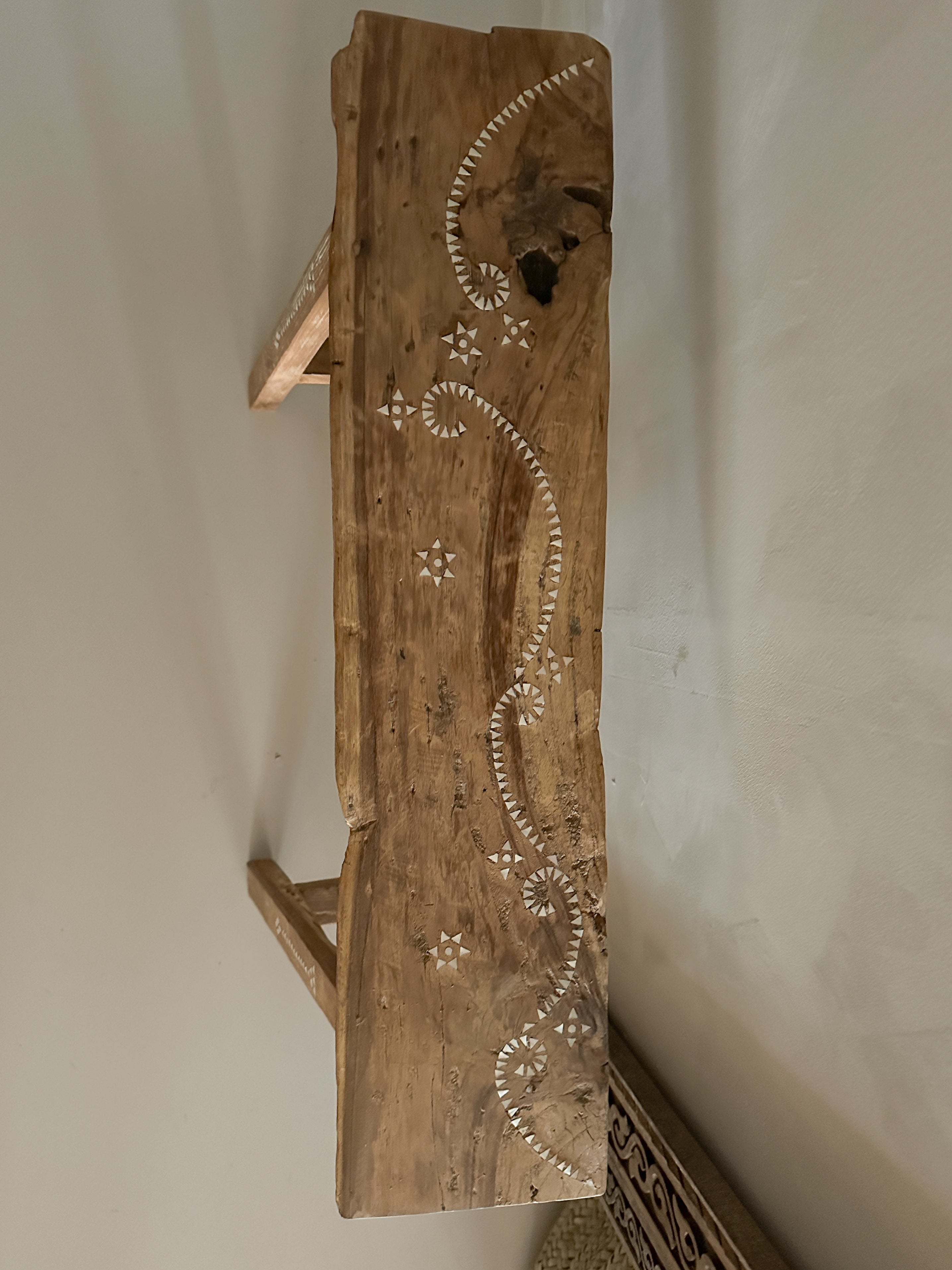Dit prachtige houten bankje is handgemaakt van oud teak hout en versierd met subtiele ingelegde schelpjes in traditionele motieven.