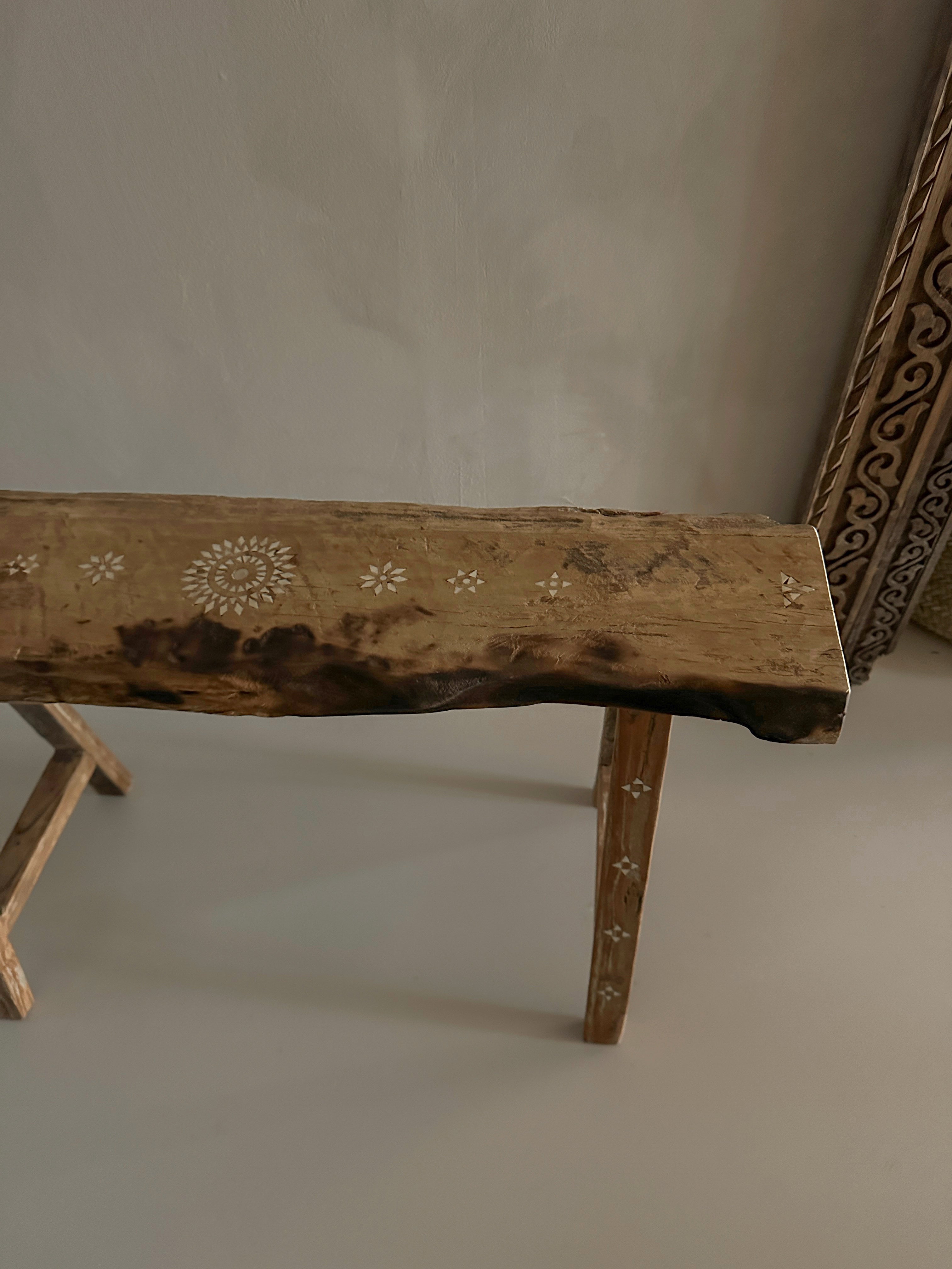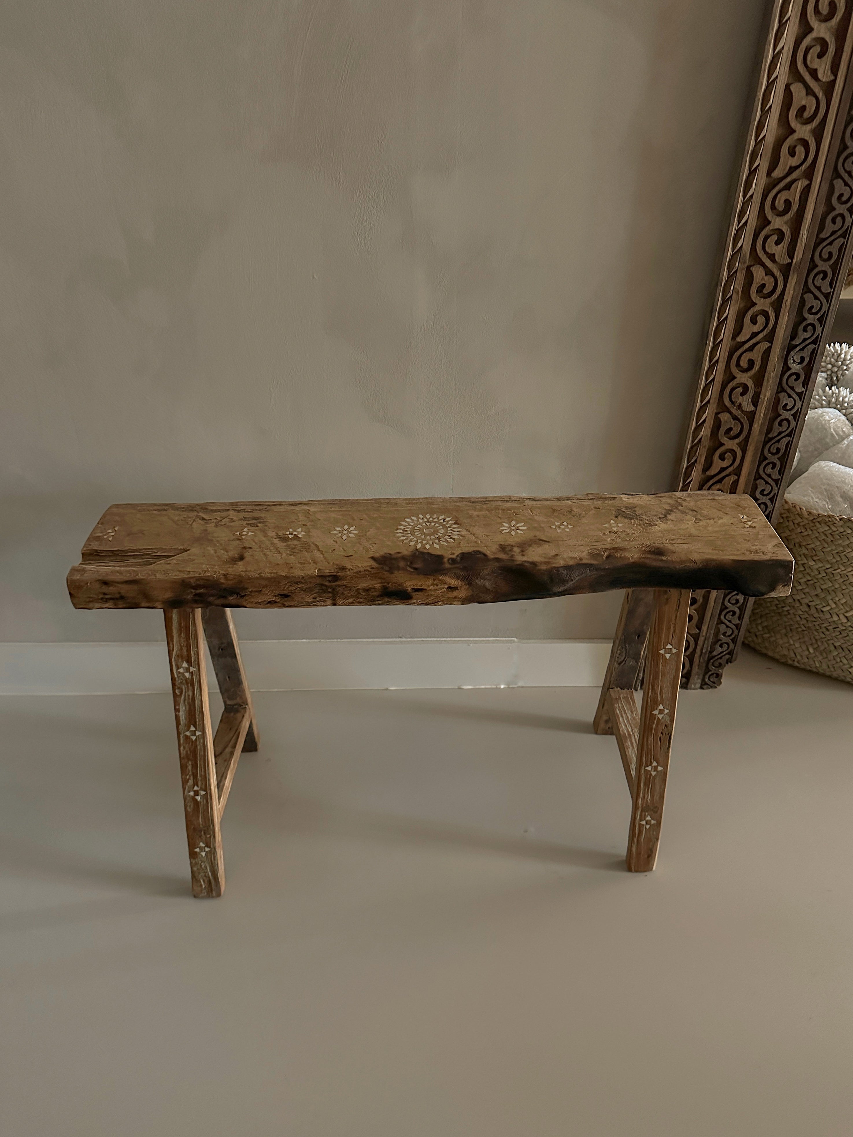 Dit prachtige houten bankje is handgemaakt van oud teak hout en versierd met subtiele ingelegde schelpjes in traditionele motieven.