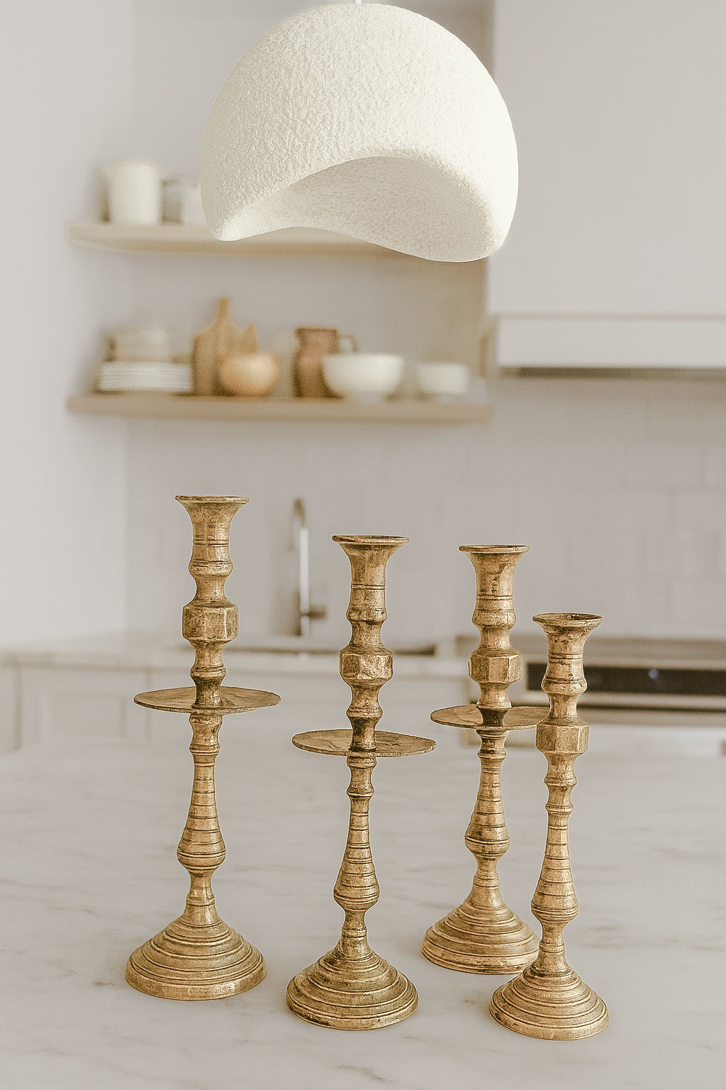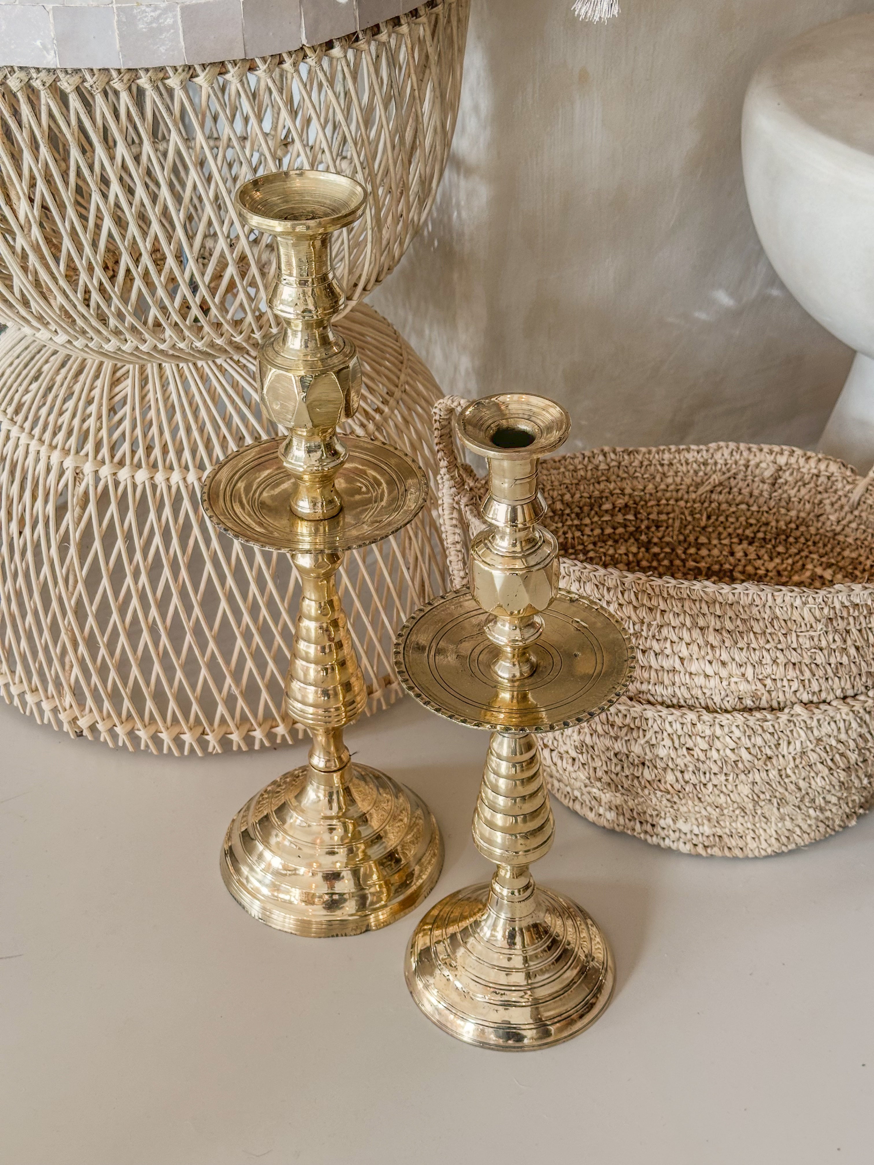De kandelaars zijn gemaakt van massief messing en hebben daardoor een zwaar, robuust gevoel. De subtiele glans van het opgepoetste koper vangt prachtig het licht, terwijl de ambachtelijke details het warme, authentieke karakter benadrukken. Perfect als statementstuk op tafel, op een dressoir, of gecombineerd in een groep voor een sfeervolle, bohemian uitstraling.
