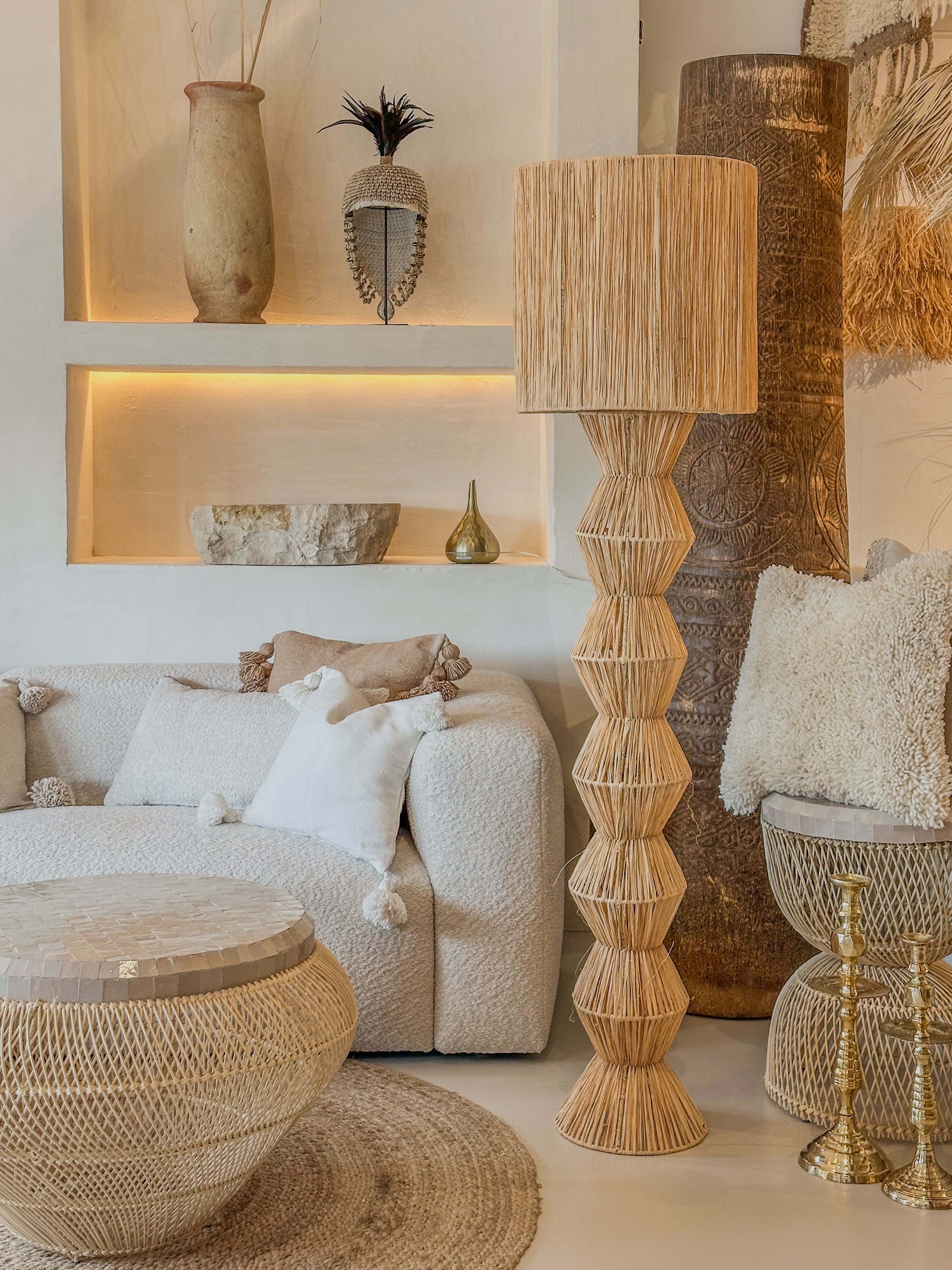 Met de hand gemaakt in Marokko, is elke lamp uniek door het zorgvuldig gevlochten raffia dat de lamp zijn prachtige structuur geeft. De organische vormen en natuurlijke tinten brengen warmte en textuur in elk interieur.