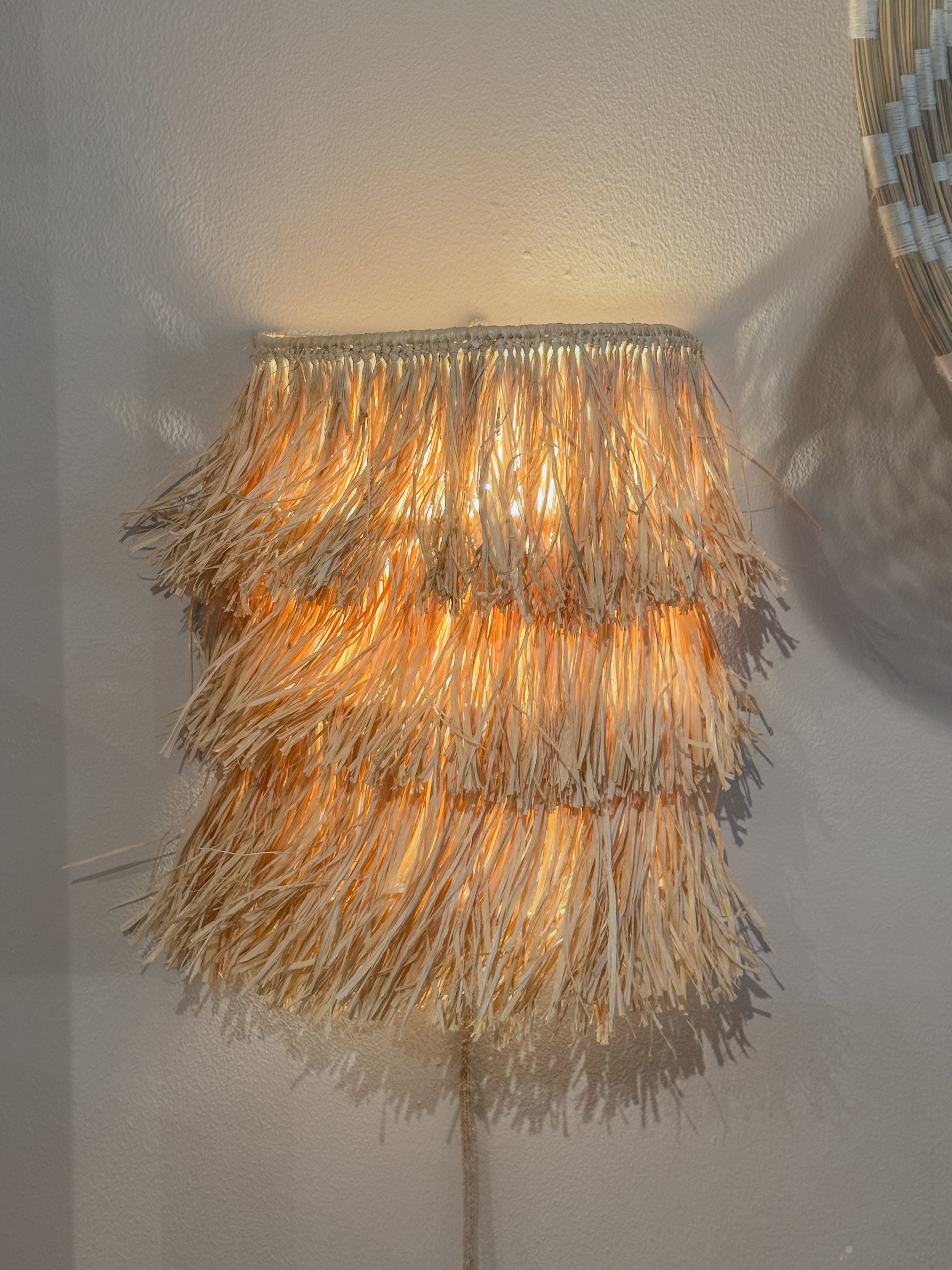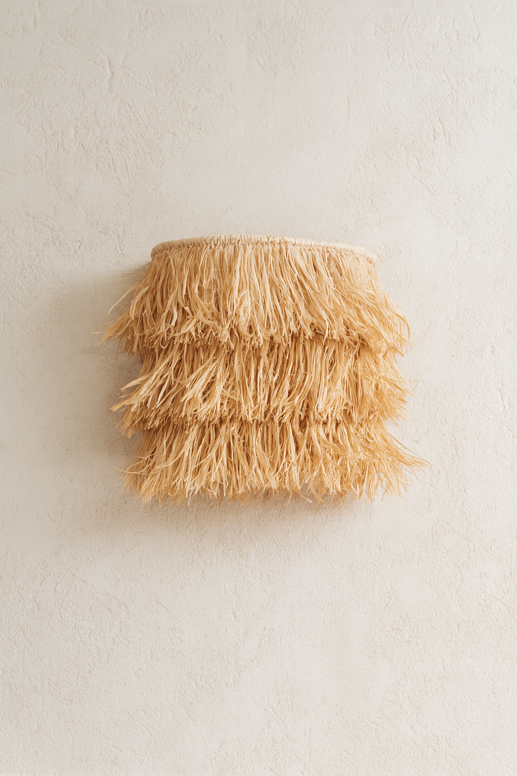 Breng warmte en natuurlijke charme in je interieur met deze prachtige handgemaakte wandlamp van raffia.